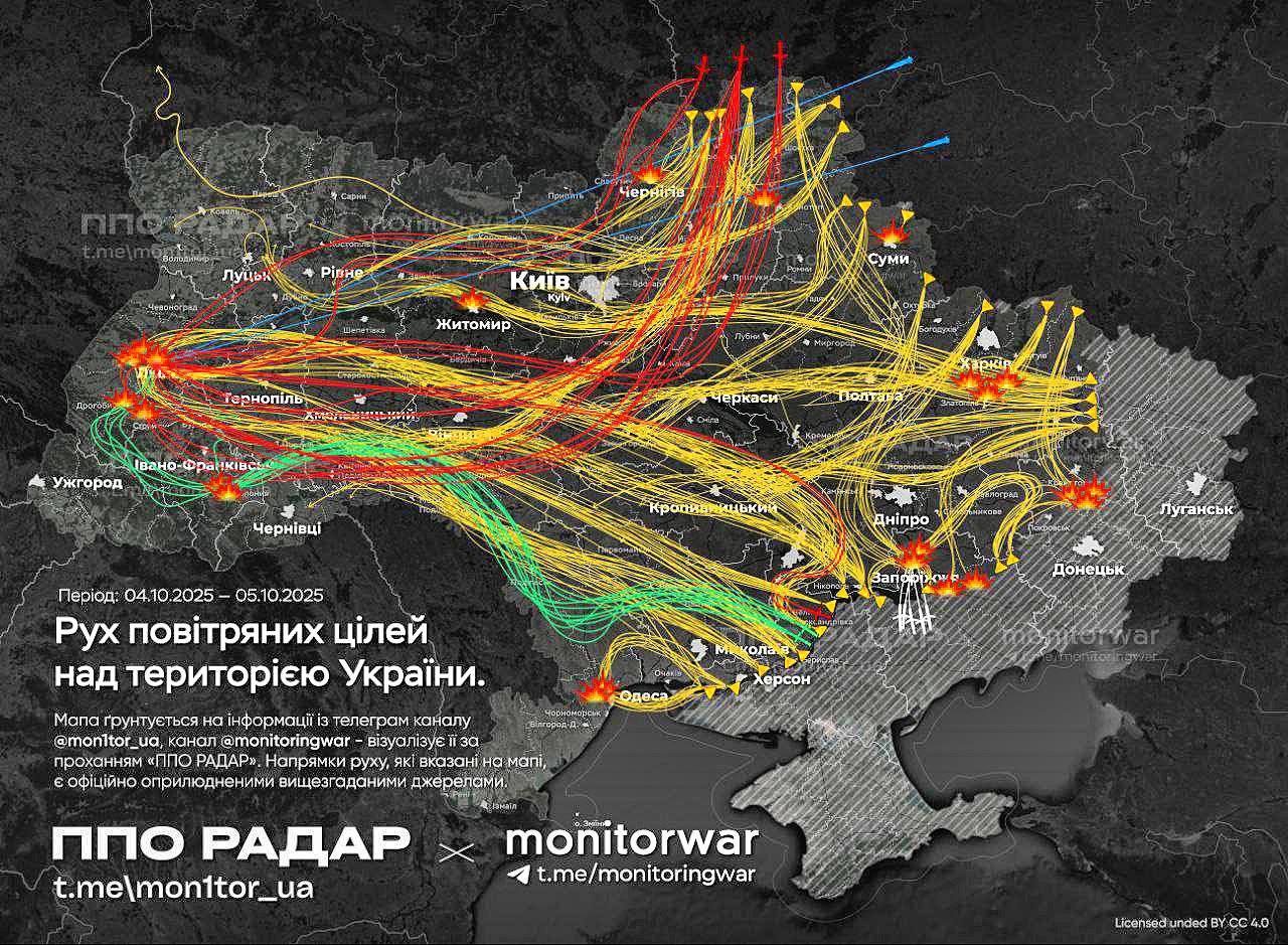 - Львів і Львівщина: В ніч проти 5 жовтня внаслідок повітряної атаки зруйновано житловий будинок у с. Лапаївка Львівського району. На місці удару загинула родина з чотирьох осіб, серед яких — 15-річна дівчинка. Ще одного члена сім’ї, а також двох мешканок сусідніх будинків з травмами різного ступеня тяжкості госпіталізовано до медичних закладів. Трьом потерпілим надано допомогу на місці. Також на території Львова та області зафіксовано низку влучань по промислових і енергетичних об’єктах. Пошкоджено виробничі та складські приміщення, гаражі, станцію технічного обслуговування, а також об’єкти енергетичної інфраструктури. Окреме загоряння виникло на одному з газових сховищ області.