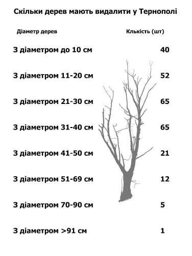 Аукціон із закупівлі послуги з видалення аварійних дерев триває, станом на 13 березня. Виконавець робіт повинен впродовж 2025 року видаляти аварійні та сухостійні дерева та проводити омолоджувальну обрізку на території Тернопільської громади та парку Загребелля.