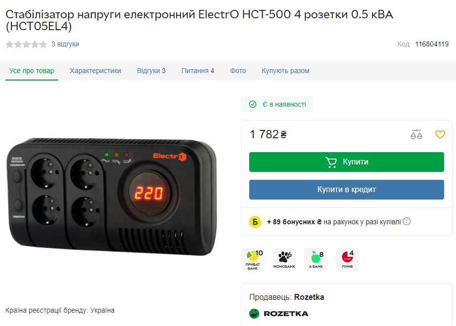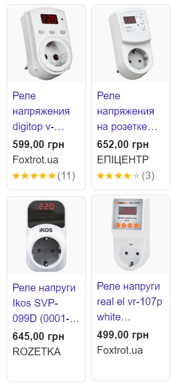 Коштує реле напруги на одну розетку приблизно 500–650 гривень в магазинах побутової техніки та при замовленні онлайн.