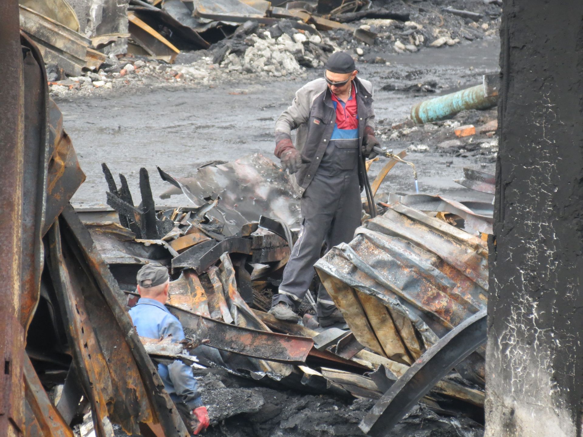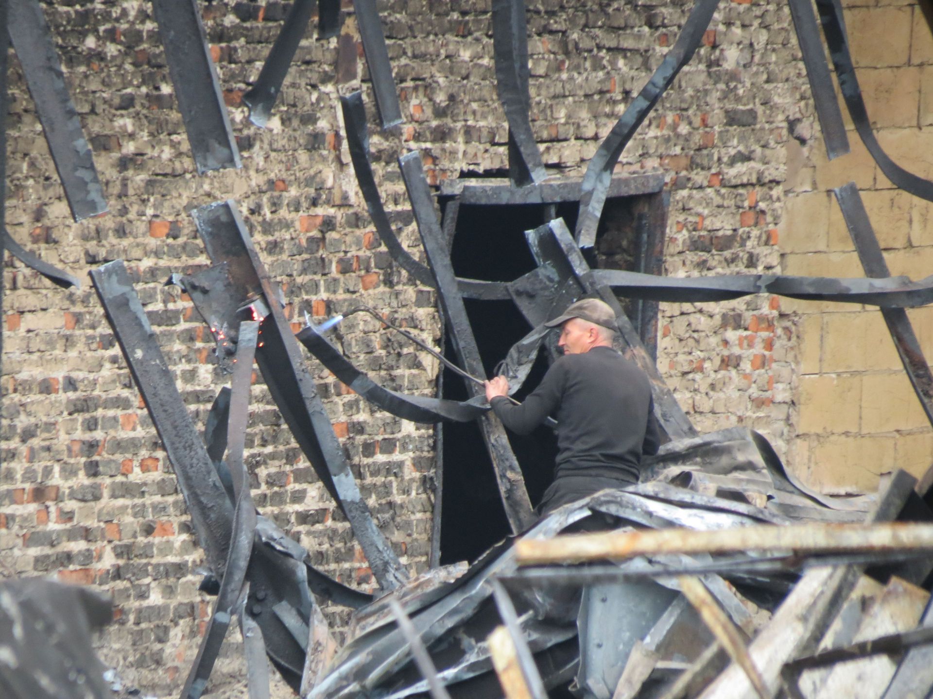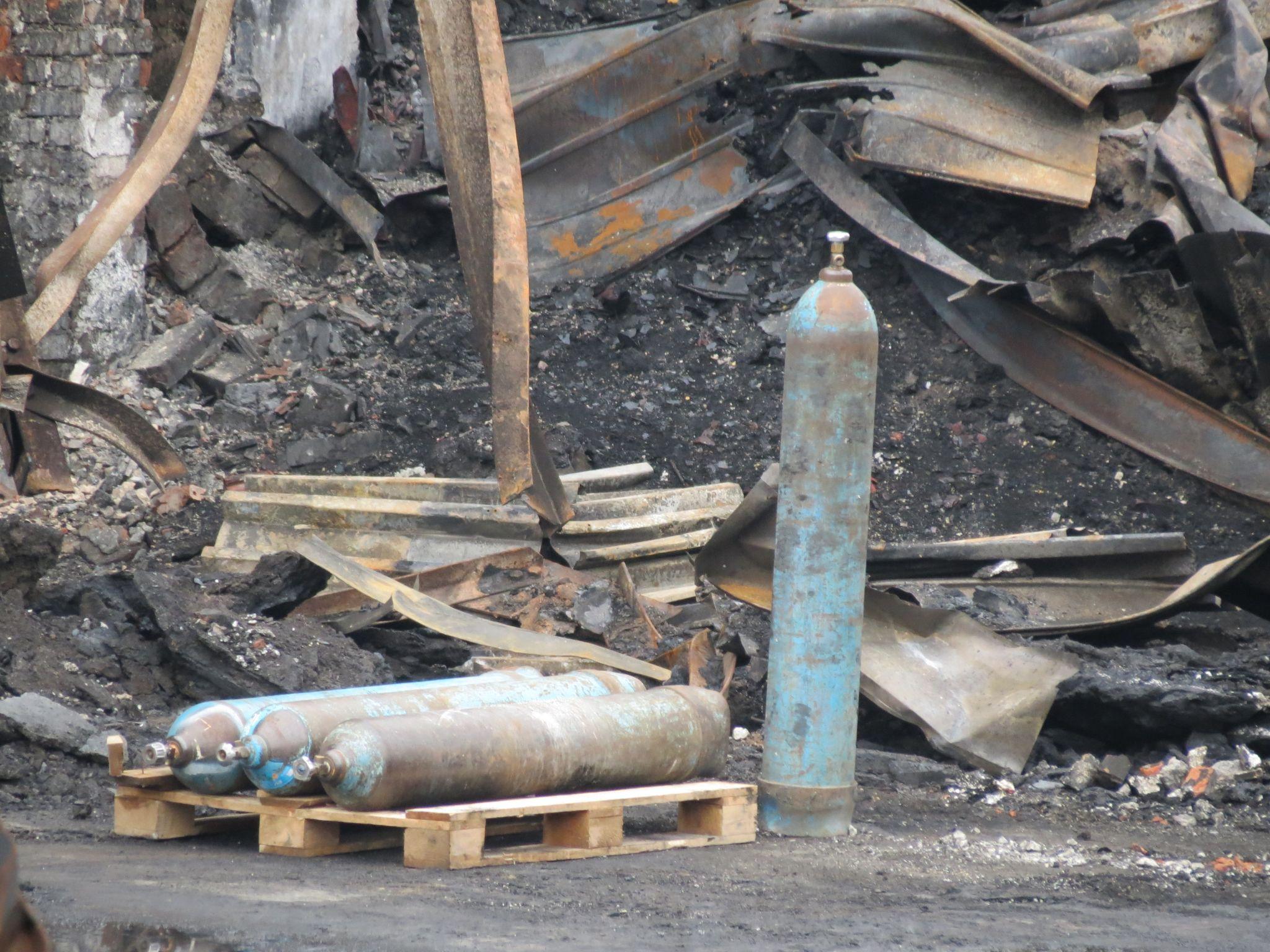 Для розбору конструкцій робітники використовують газові різаки. Імовірно, що балони з киснем використовують саме для них. Ми побачили кілька таких балонів поруч з робітниками, які розрізали металеві конструкції.