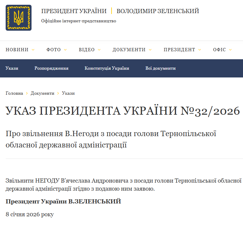 Президент підписав указ про звільнення В’ячеслава Негоди з посади голови Тернопільської ОДА