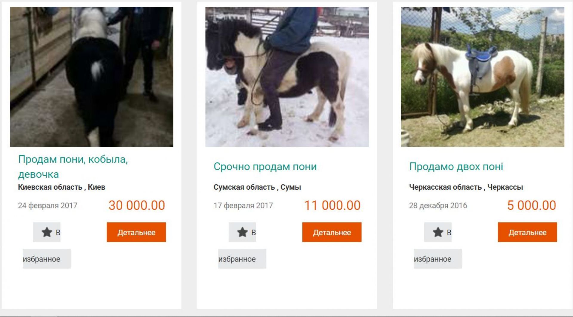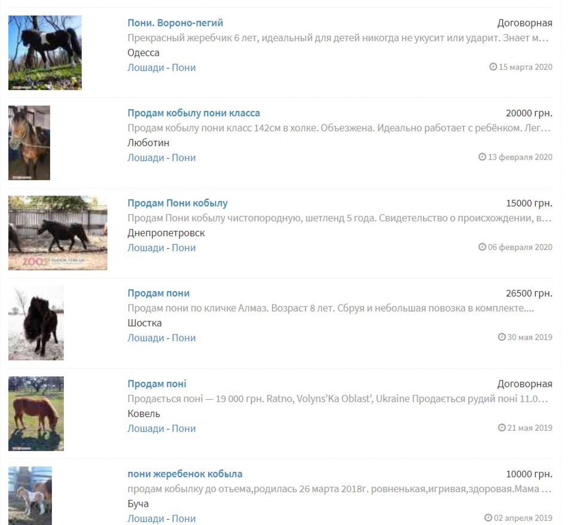 На сайтах з продажу тварин ми знайшли різні пропозиції по продажу поні. Їх вартість залежить від породи та віку. Можна знайти поні за 10 тис. а є породисті тварини за 50 та навть 90 тис. Є і оголошення, де поні терміново продають за 5 тис. гривень.