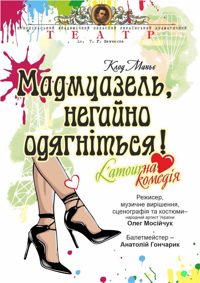«Молодий художник Блез д'Амбріє, аби покінчити з безгрошів’ям, погоджується на авантюрний крок – одружитися на вигідній нареченій, щоб зробити кар’єру успішного художника. На це Блеза спонукає коханка Женєв’єва. Вона вмовляє його зняти фешенебельну квартиру, найняти першокласних слуг, видаючи себе за респектабельного художника, щоб справити враження на наречену та її батьків. І звісно, як і годиться в комедії, Блез не раз опиняється на межі «провалу», бо замість обіцяного метрдотеля бюро послуг присилає молоденьку, недосвідчену служницю Марі із далекої провінції, яка не тільки невміло прислуговує, та ще й своєю наївністю руйнує всі його плани… Повороти сюжету, інтриги, іскрометний гумор у комедії «Мадмуазель, негайно одягніться!» – такий опис цієї вистави.