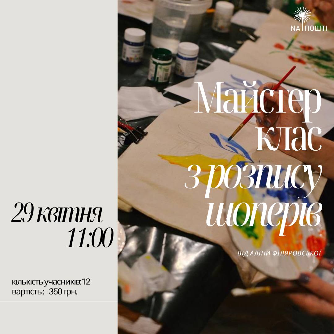 Тернополяни матимуть шанс власноруч створити свою торбинку з унікальним малюнком. Навчить цьому майстриня Аліна Філяровська. Кількість учасників майстер-класу обмежена – в групу можуть набрати лише 12 осіб. Тому поспішайте зареєструватись! Вас забезпечать необхідними матеріалами.