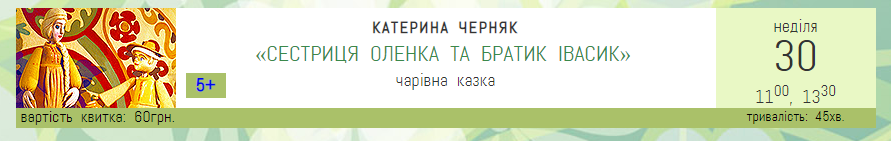 Час і локація: початок об 11:00, тоді – о 13:30, тривалість – 45 хвилин, Тернопільський академічний обласний театр актора і ляльки.