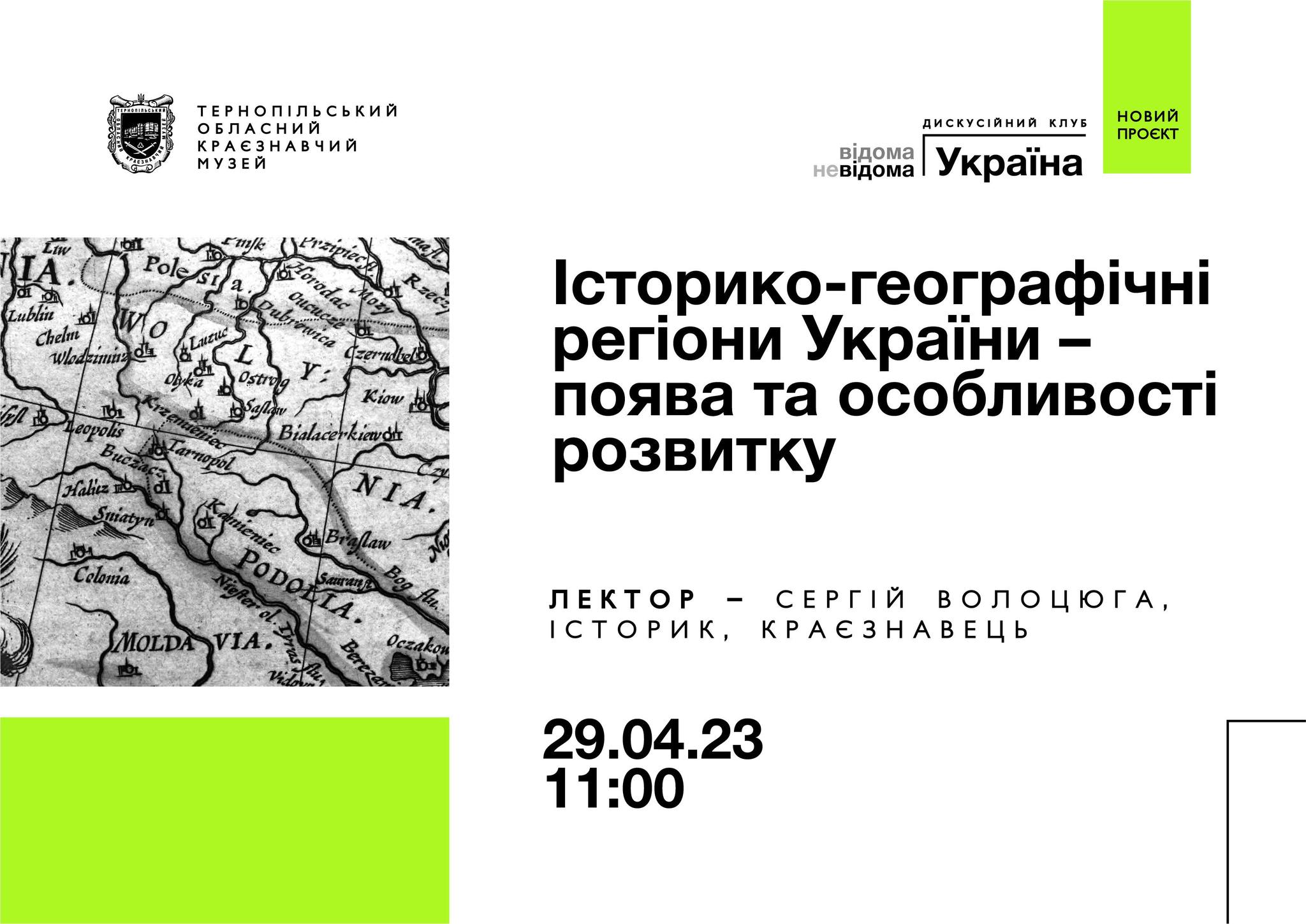 В рамках музейного проєкту містян запрошують стати учасниками дискусійного клубу. Тема лекції: «Історико-географічні регіони України – поява та особливості розвитку». Проведе її Сергій Волоцюга, історик, краєзнавець, учитель Тернопільської школи № 8. Ви дізнаєтесь про те, чому і коли з'явились назви «Галичина», «Слобожанщина», «Волинь», «Таврія», а також інші цікавинки про нашу історію.