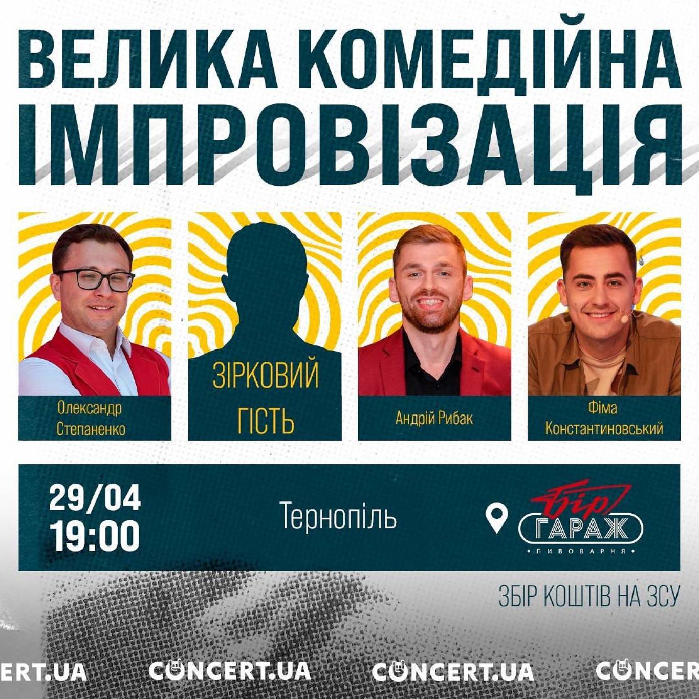 Досвідчені коміки, неймовірні емоції та гарний настрій чекатимуть на вас. Велика комедійна імпровізація — гумористичне шоу, на якому ви станете не просто глядачами, а безпосередніми учасниками комедійного дійства. Відповідальними за настрій вечора будуть: Андрій Рибак, Фіма Константиновський, Саша Степаненко та зірковий гість. Зібрані кошти перерахують на потреби ЗСУ.
