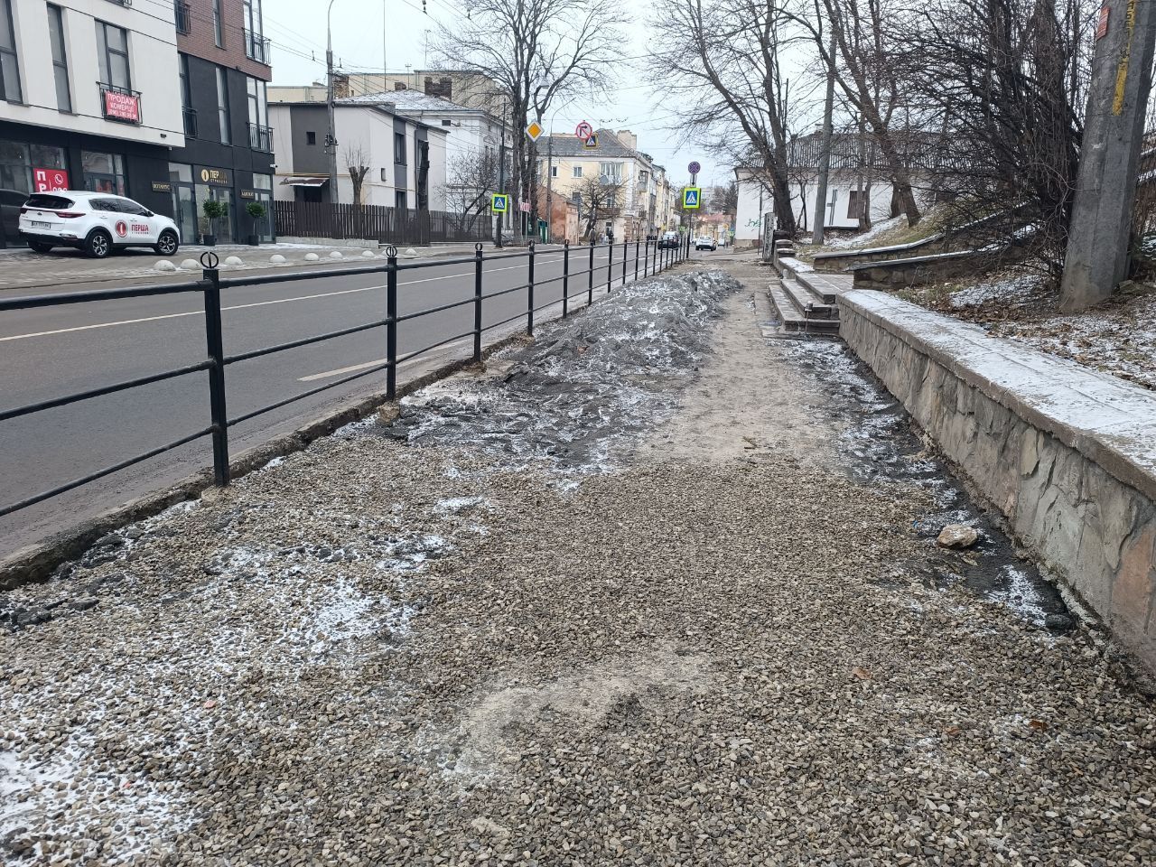 Також зз іншої сторони вулиці прокладають нові комунікації. Через це викопали траншею від вулиці Перля до «Рогатки». Її обгородили стрічкою. Тому прохід на деяких ділянках ускладнений.