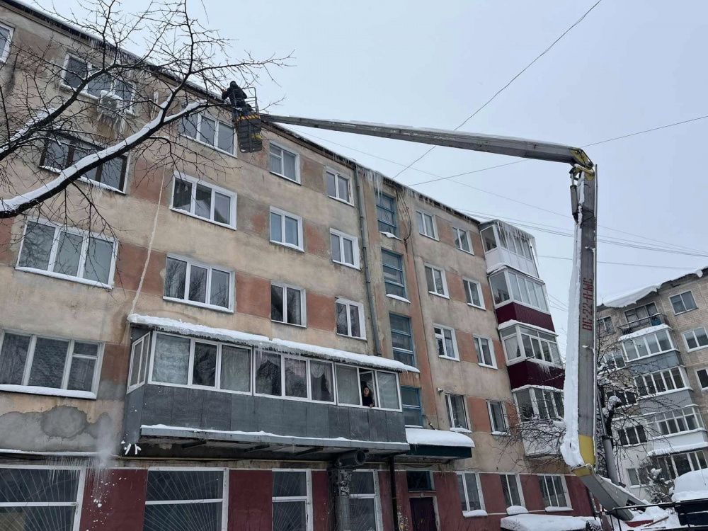 Промислові альпіністи на автопідйомниках збивають бурульки з дахів тернопільських будинків