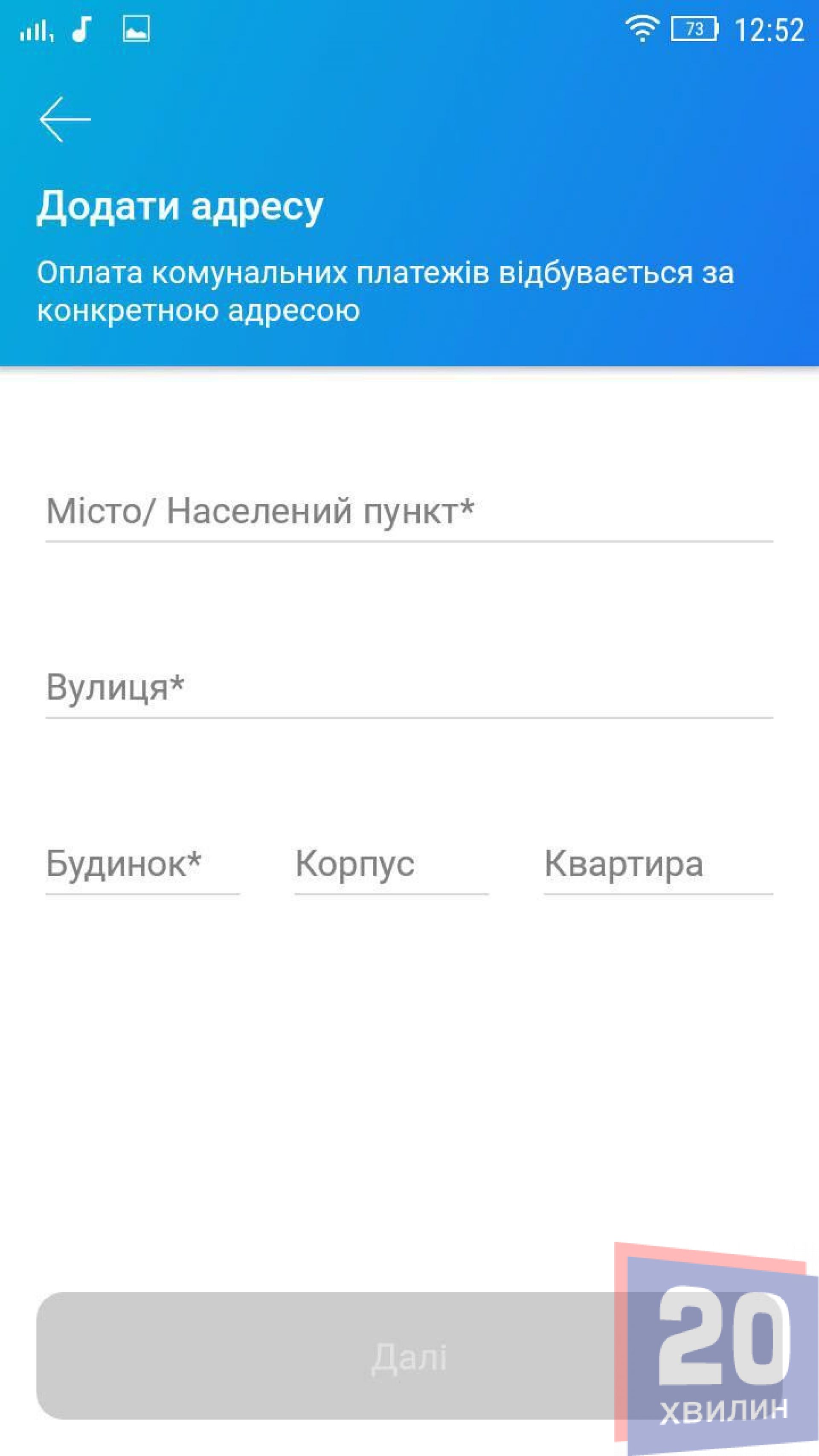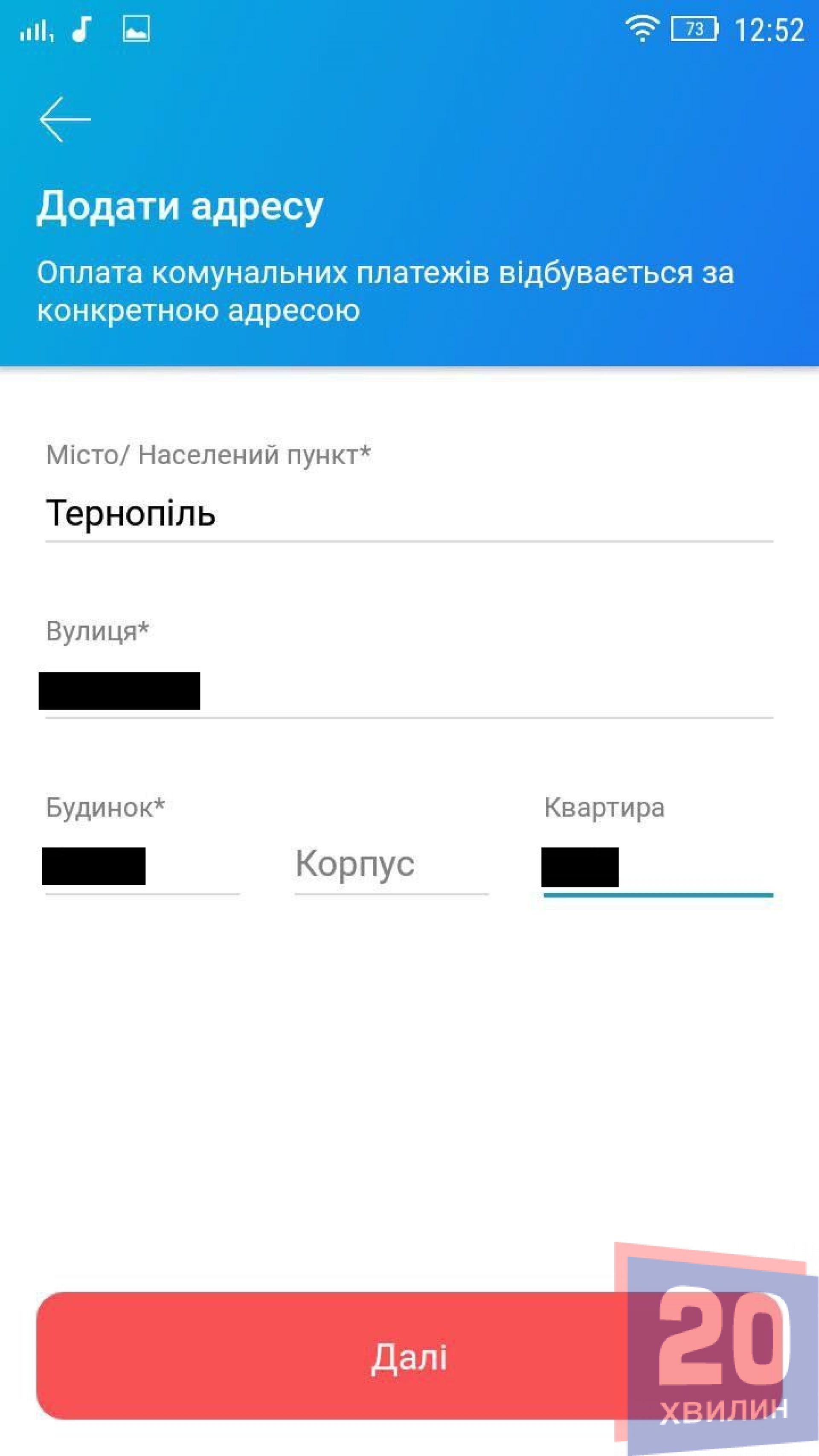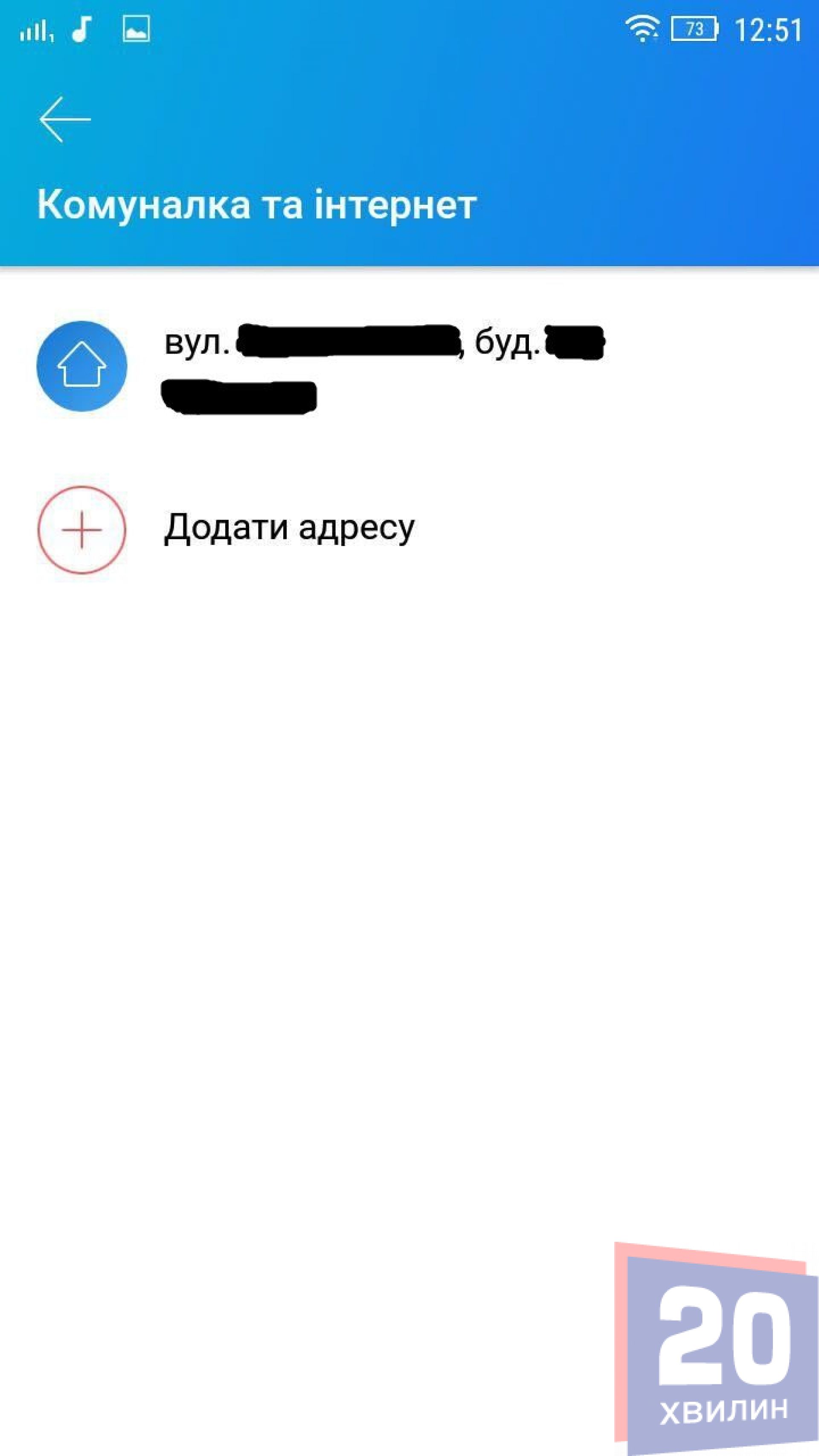 Спершу потрібно авторизуватися в мобільному додатку ввівши свій пін-код. Обираємо «Інші платежі» та заходимо в розділ «Комуналка та інтернет». За замовчуванням там буде відображатися адреса прописки. Якщо, до прикладу, ви знімаєте квартиру, або хочете заплатити за комунальні послуги батькам – можна додати їх адресу. Для цього вводимо місто, вулицю, будинок та квартиру.