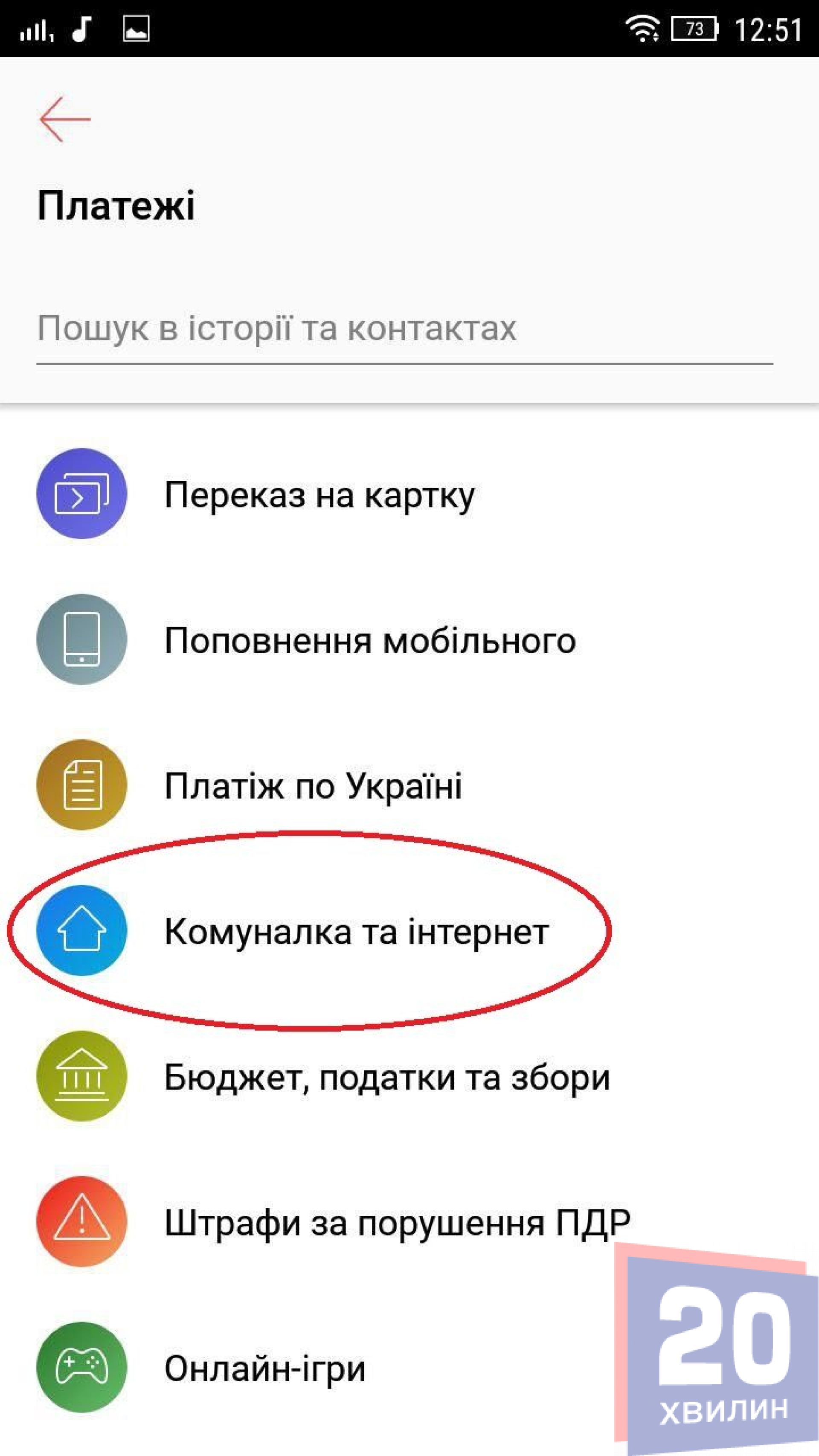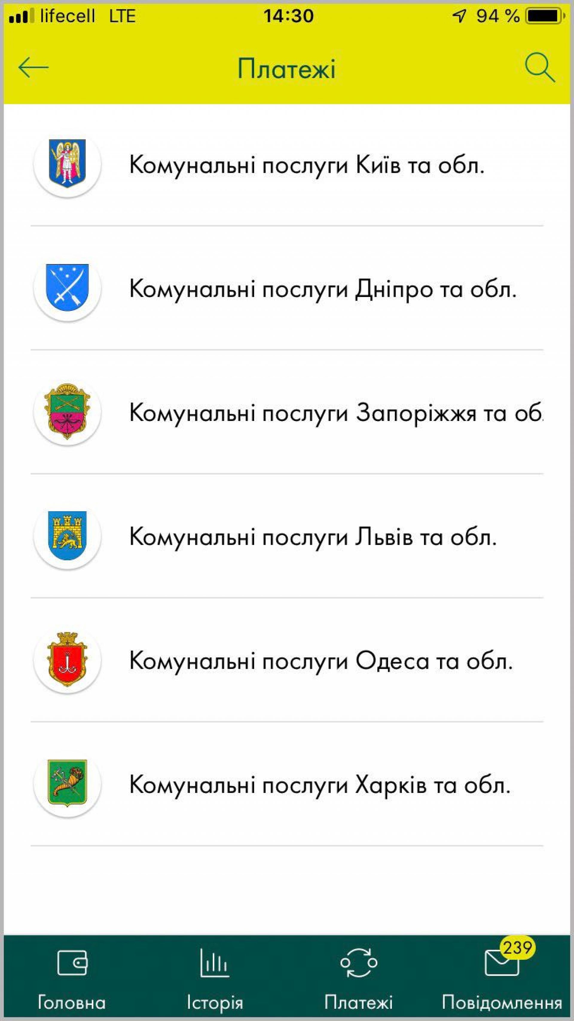 Для оплати послуг потрібно зайти та авторизуватись через мобільний додаток. Заходимо до розділу «Платежі» головного меню та переходим у розділ «Комінальні послуги». Знаходимо у списку постачальника комунальних послуг.