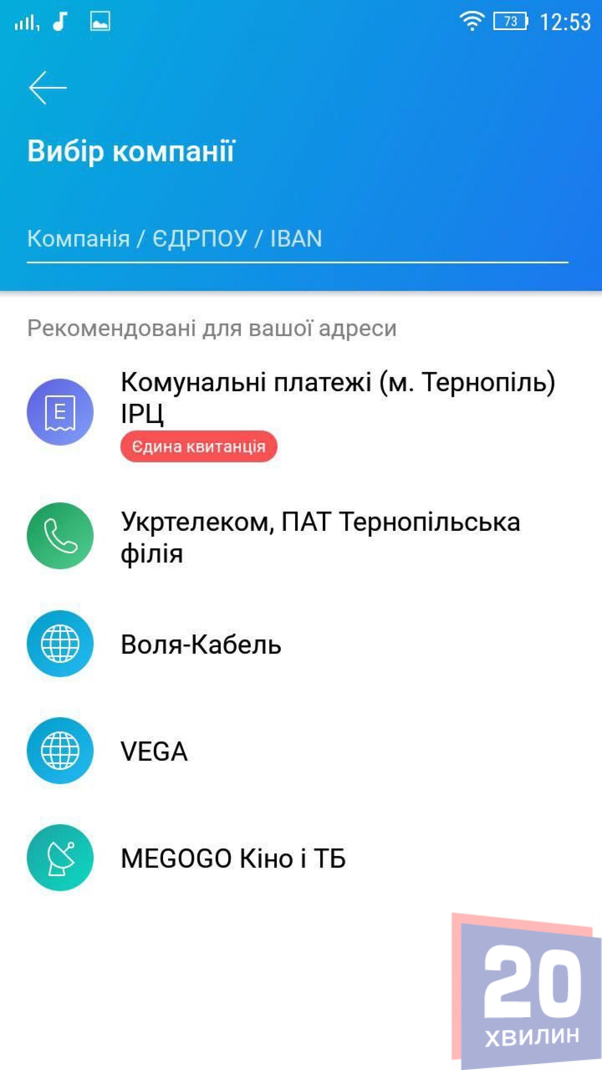 Далі обираємо компанії для оплати комуналки. Відображається «Єдина квитанція», де можна розррахуватися за всю комуналку. Також в цьому розділі можна заплатити за інтернет, телефон, телебачння чи інші додаткові послуги, яких немає у єдиній квитанції.