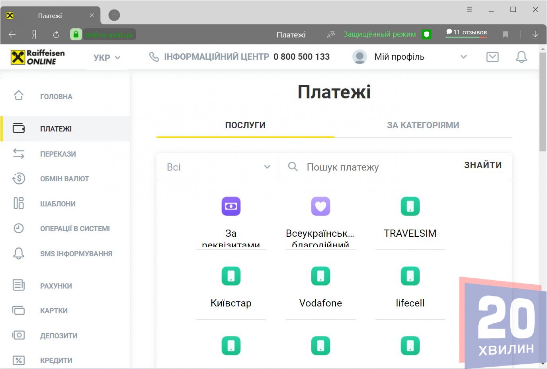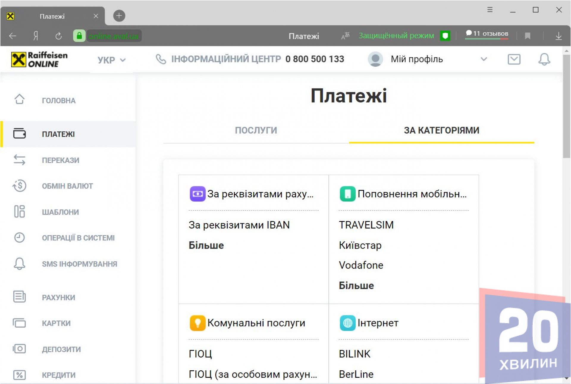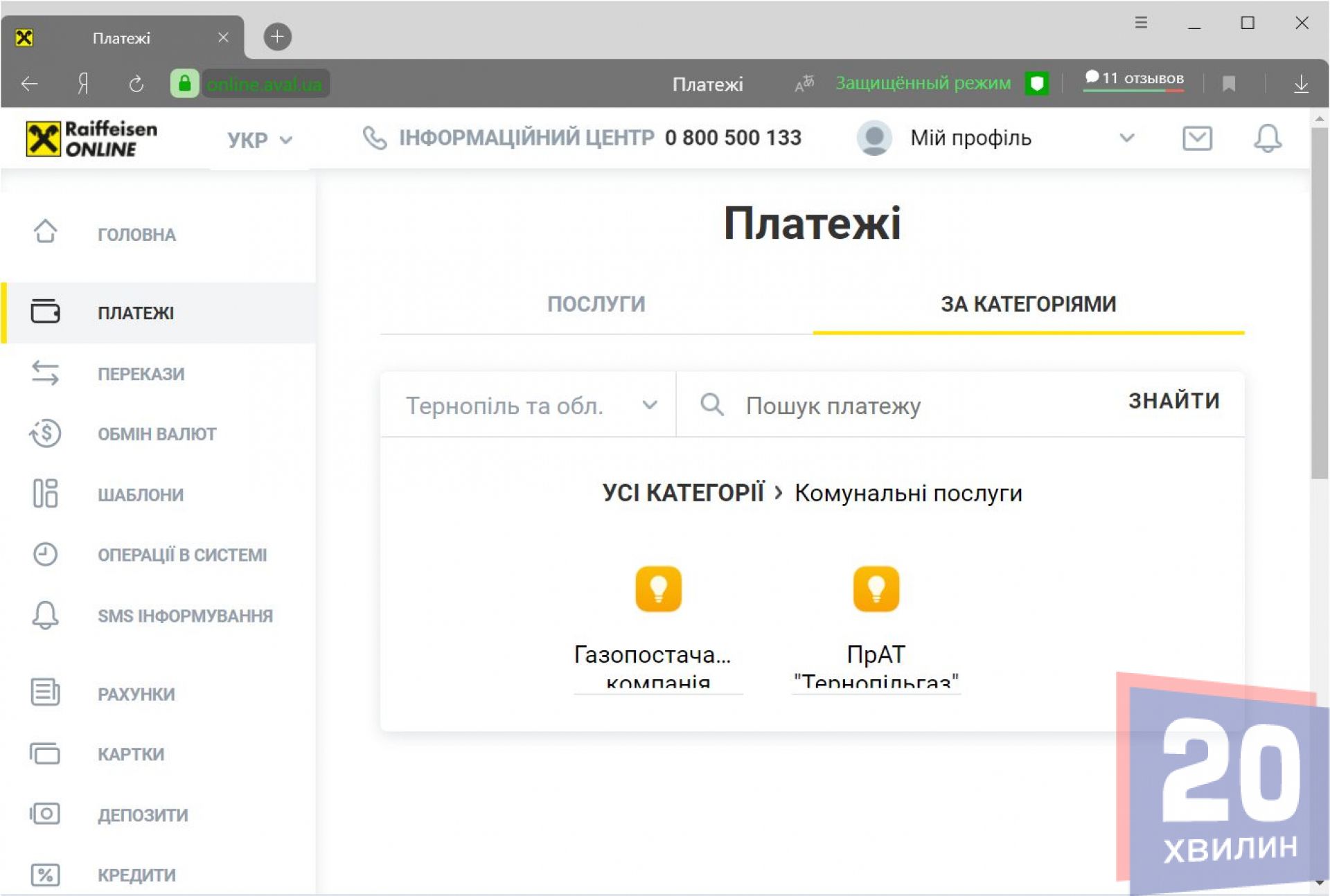 Клієнти Райффайзен Банк Авалю також можуть зараєструватись в онлайн-банкінгу і сплачувати комунальні послуги. Для цього треба авторизуватися в системі та перейти у розділ «Платежі». Там за допомогою пошуку потрібно знаходити потрібні компанії. Можна перевірити показники лічильника, чи правильно вам нарахували заборгованість.