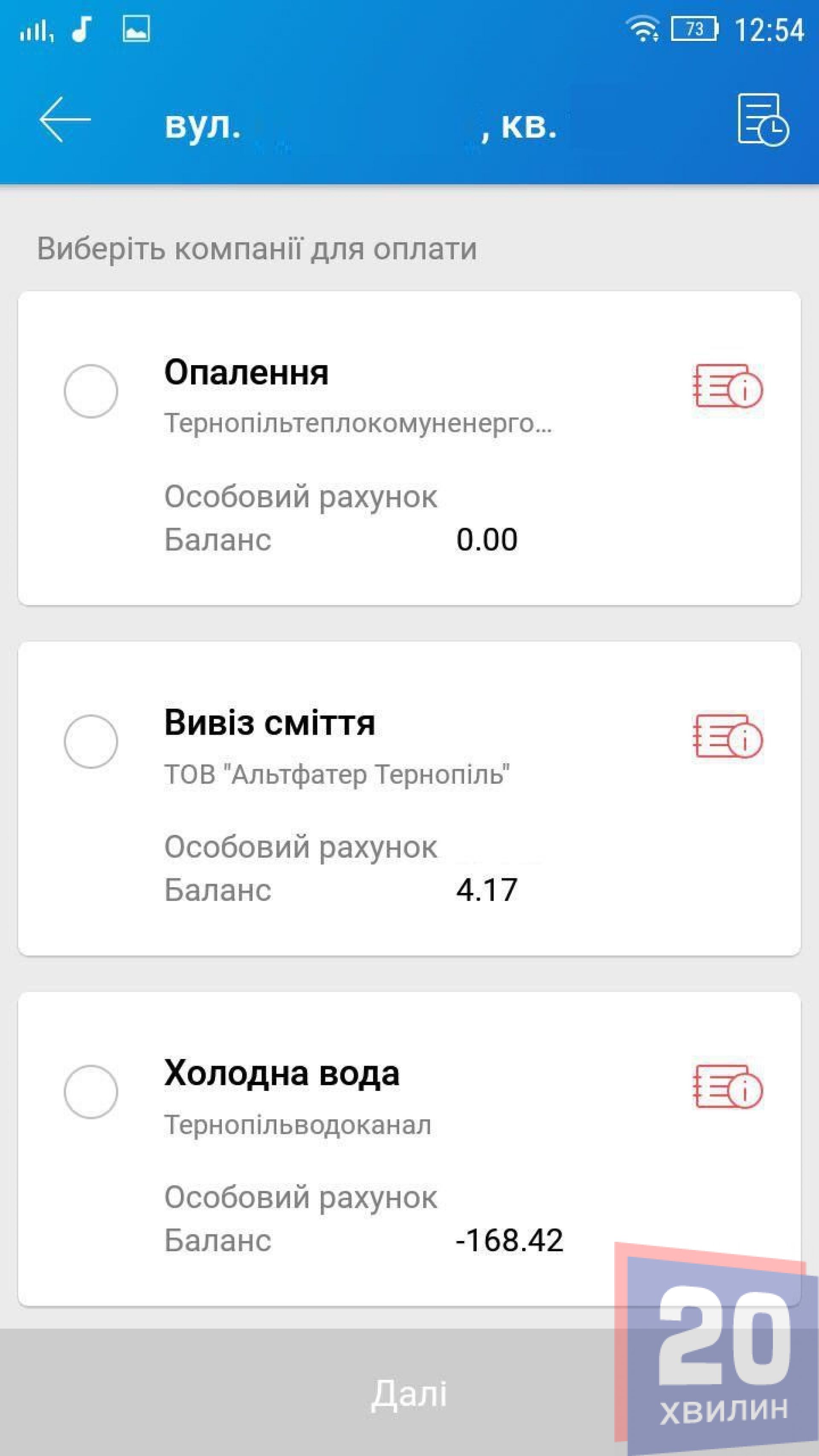 Натискаємо на «Комунальні платежі (м. Тернопіль) ІРЦ». Вводимо знову вашу адресу і бачимо інформацію про заборгованість. Можна обрати окремі послуги, за які ви хочете заплатити і натиснути «Далі». Після цього потрібно підтвердити платіж.