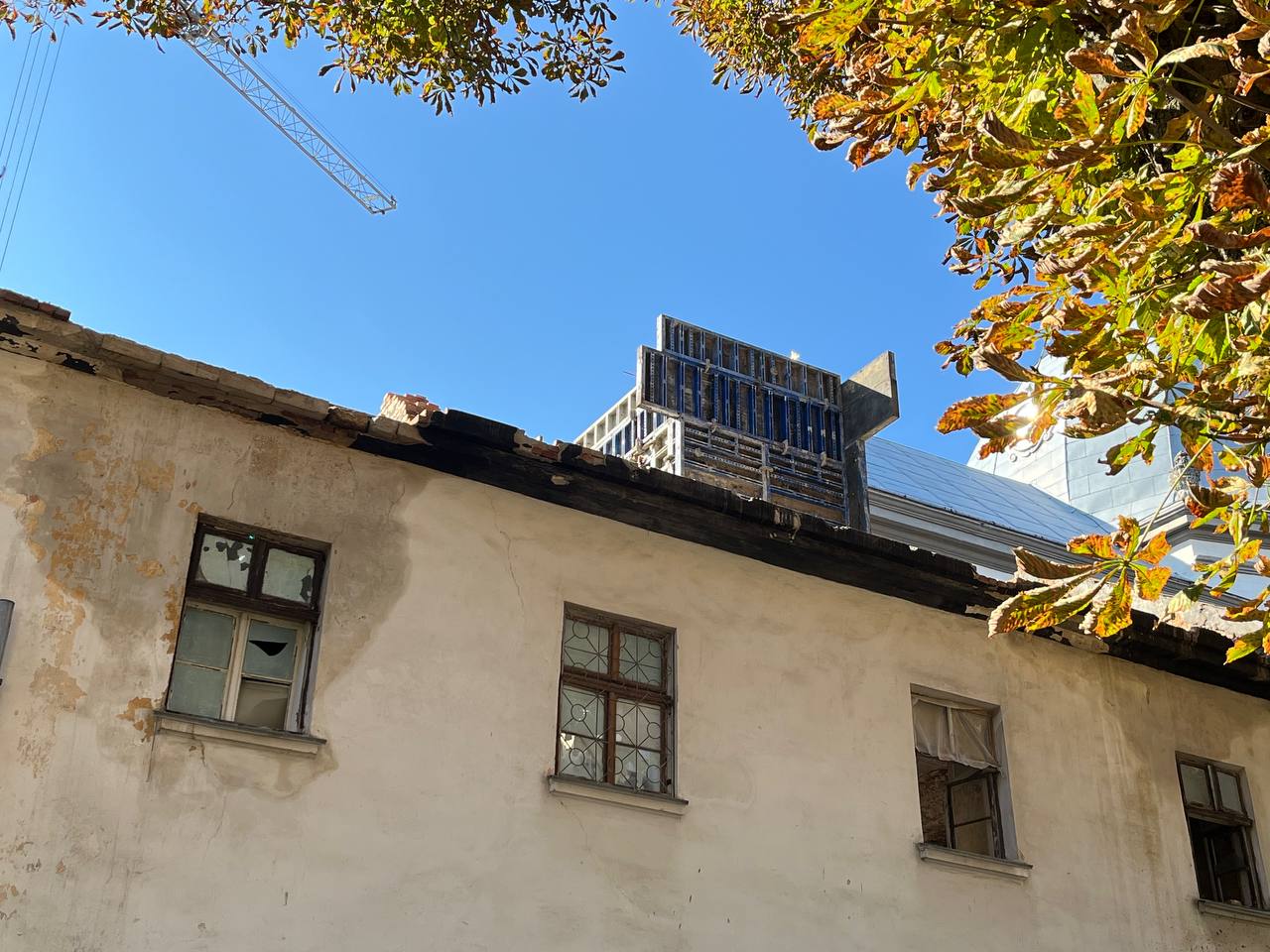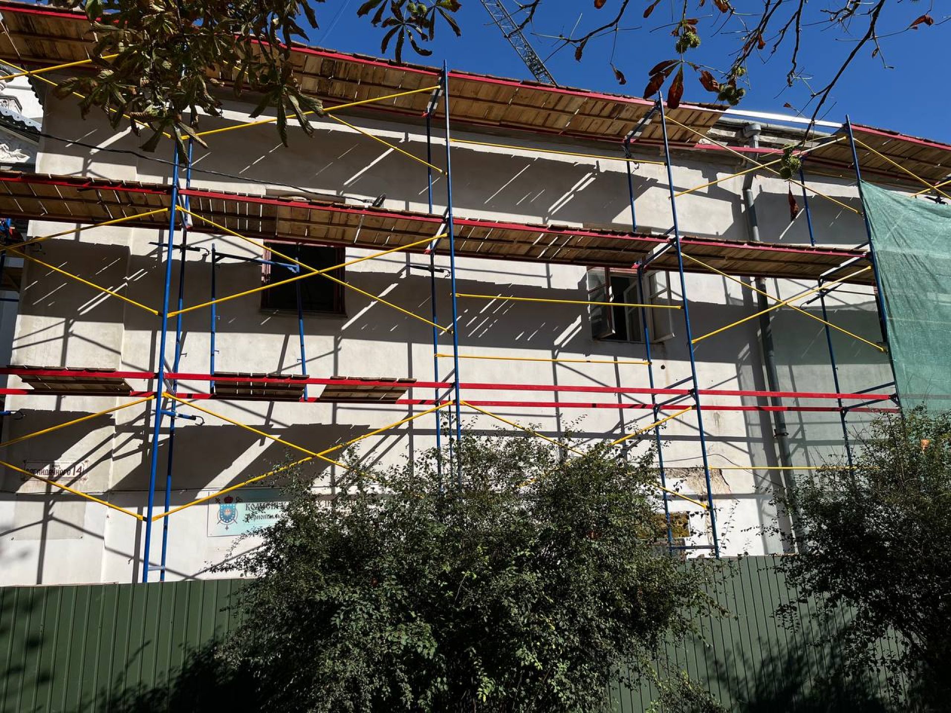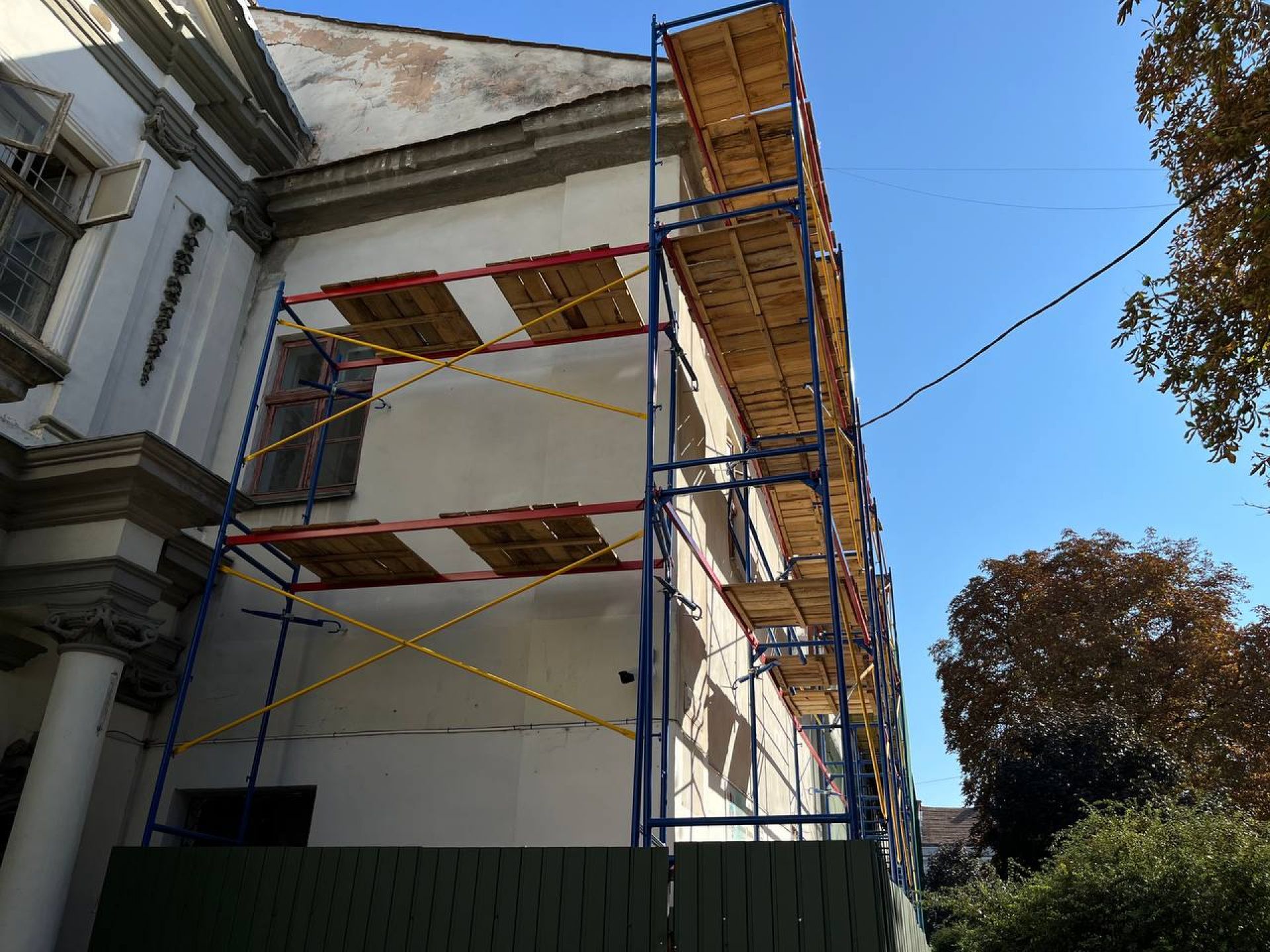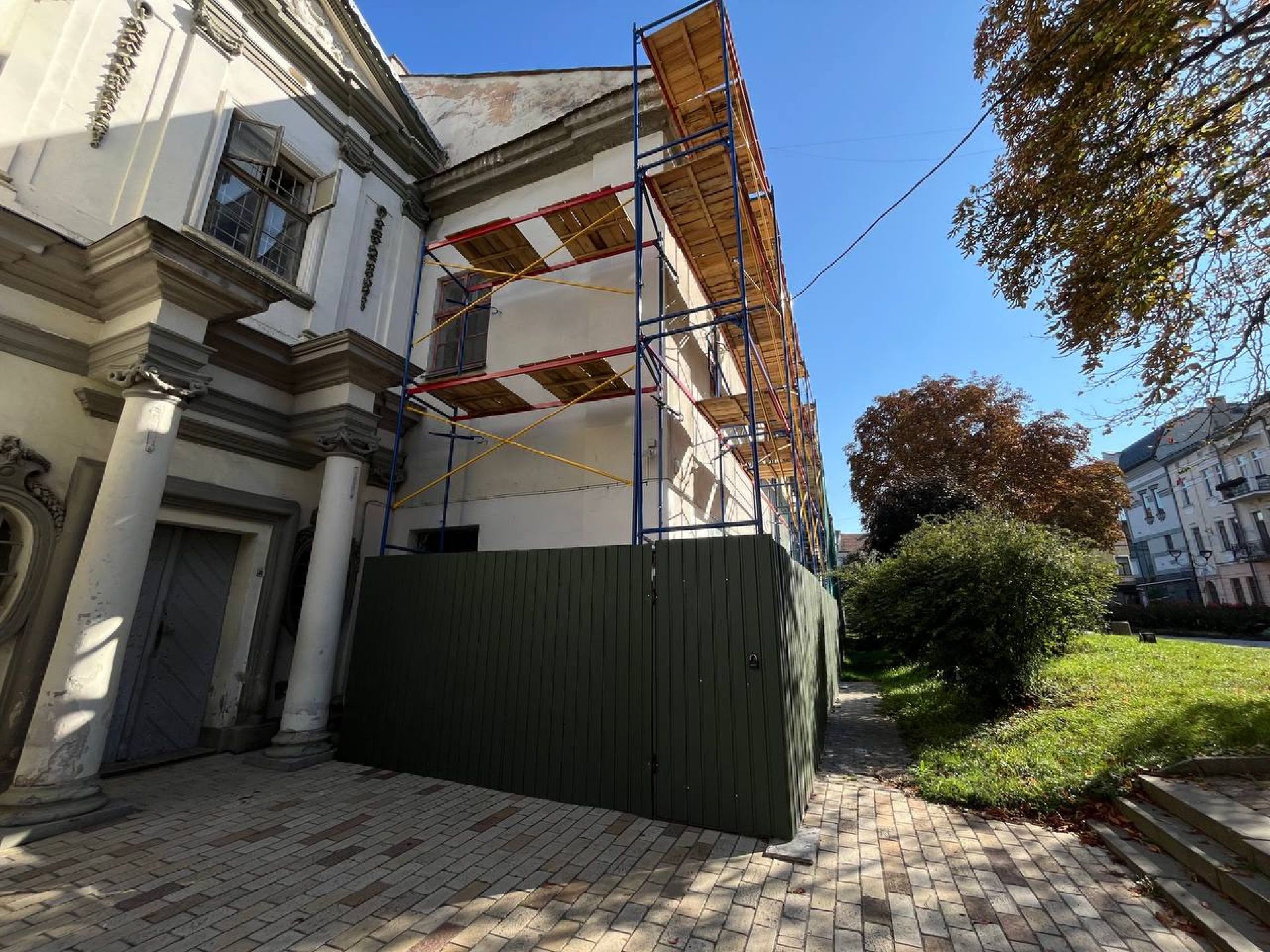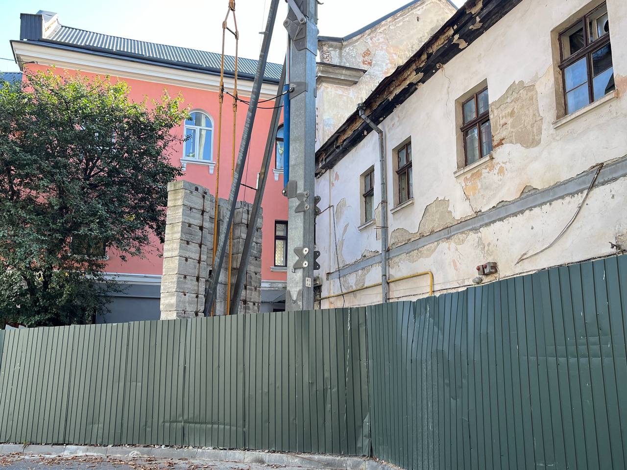 По периметру будівлі залишається огорожа – металевий паркан. Також навколо фасаду, зі сторони вулиці Сагайдачного, встановили риштування та завісили спеціальною сіткою.