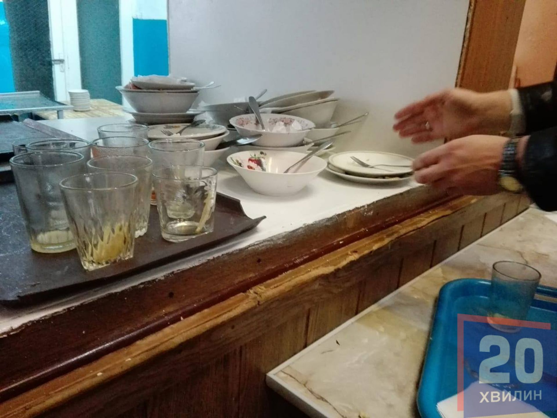 Брудний посуд разом з підносом потрібно самостійно занести до спеціального віконечка, звідки його заберуть посудомийниці. У віконечко самому потрібно розкласти посуд: тарілки на одну сторону, склянки на іншу. А піднос покладіть на стіл, який стоїть поруч. Його витре пані та знову віднесе до столу, де роздають їжу.
