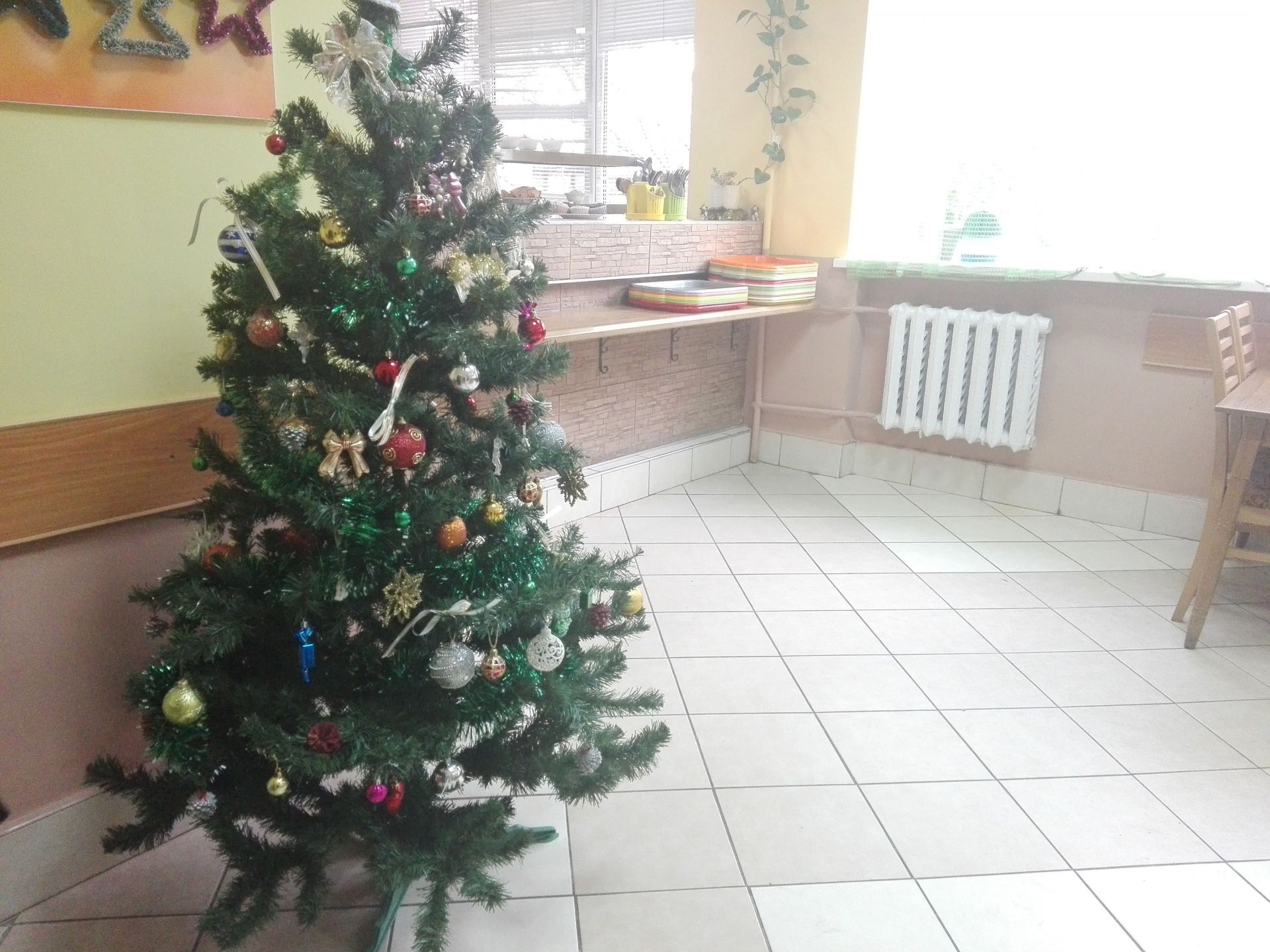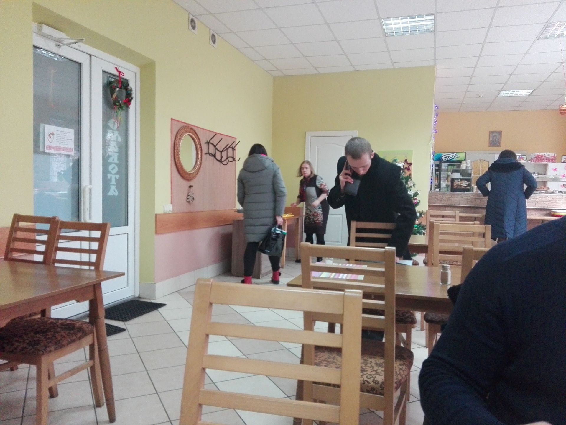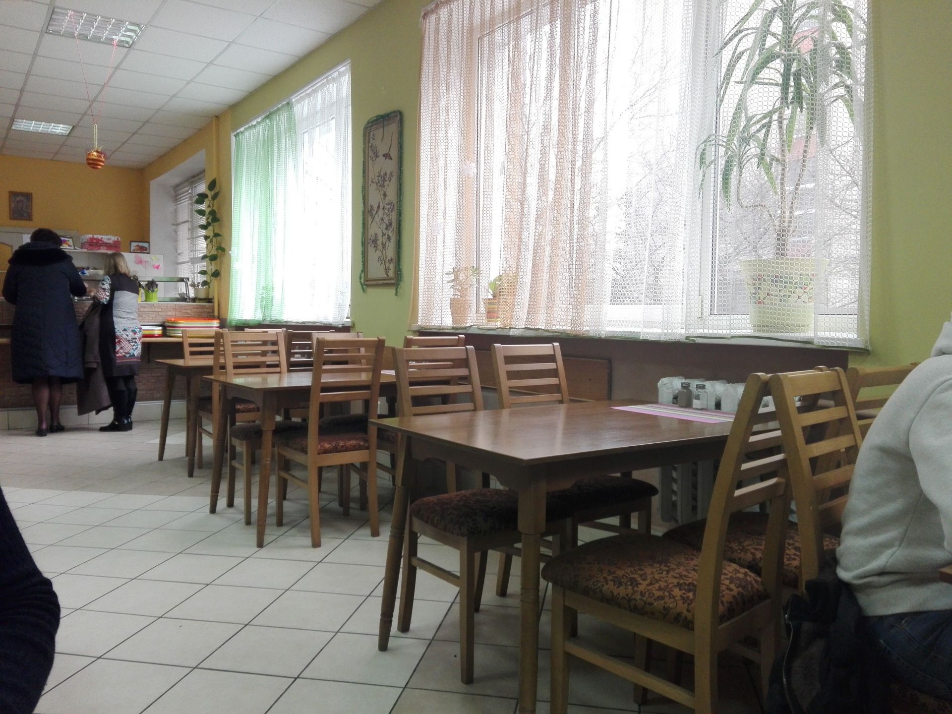 Інтер'єр. Приміщення їдальні невелике, світле, відремонтоване. Столи та крісла нові, чисті. Їх у їдальні 10. При вході у їдальню є вішак для одягу та дзеркало. Поруч стоять столи для брудного посуду та підносів. У буфеті є випічка, печиво, порційні салати, холодильник з напоями, кавоварка. Також стоять чисті підноси, виделки та ложки. На стіні висить велике меню. На столах зручні сільнички з перечниця. Їдальню уже прикрасили до Нового року: ялинка, святкові декорації на годиннику та на стелі. Також є обігрівач.