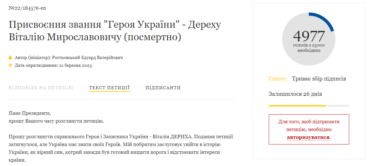 Журналісти «20 хвилин» закликають долучитися до підписання петиції про присвоєння Віталію Дереху звання «Героя України». Її зареєстрував товариш військового Едуард Ростковський. До кінця збору підписів залишилось 26 днів. Станом на 27 травня, петиція набрала 4977 голосів з 25 000 необхідних. Не будьте байдужими, хвилина вашого часу значно прискорить цей процес.