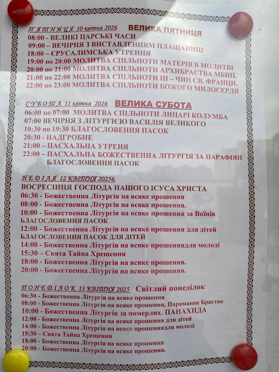 У святковий день на 05:30 проведуть Пасхальну Утреню, літургію Іоана Золотоустого А з 8 ранку і до вечора освячуватимуть паски. О 17:00 всі охочі можуть долучитися до Великоднього вечірнього богослужіння.