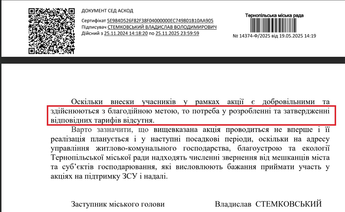 — Оскільки внески учасників у рамках акції є добровільними та здійснюються з благодійною метою, то потреба у розробленні та затвердженні відповідних тарифів відсутня, — відповів Владислав Стемковський.