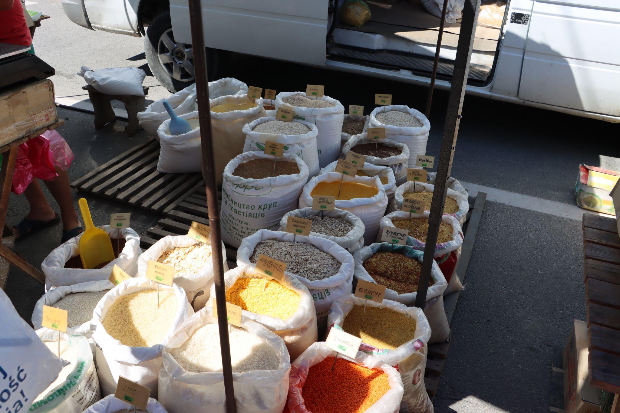 Є великий асортимент круп. Їх продають на вагу. Манна крупа коштує 20 грн/кг, ячмінна – 16 грн/кг, гркчка біла – 40 грн/кг, льон – 50 грн/кг, перловка – 16 грн/кг, кукурудзяна – 22 грн/кг, булгур – 66 грн/кг, сочевиця – 75 грн/кг, рис – 60 грн/кг.