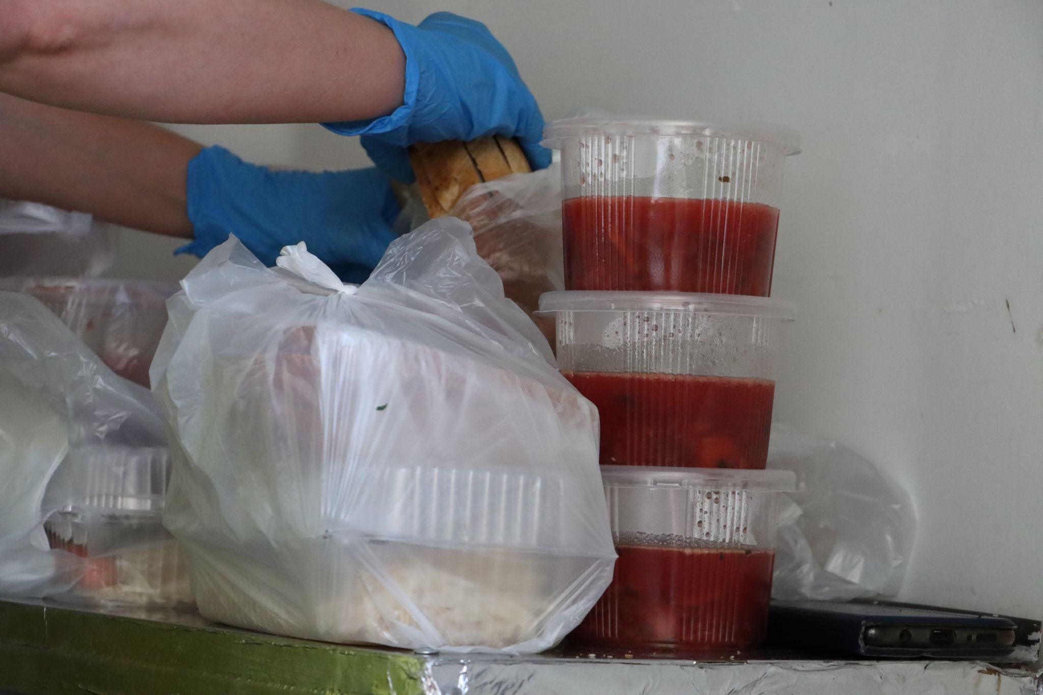 – Хтось наливає борщ, хтось закриває кришечку, насипає кашу, кладе салат, збирає лотки в пакетик, кладе хліб та прибори. Тому в нас такий конвеєр, щоб ми могли максимально швидко роздати людям гарячі обіди, – каже Світлана.
