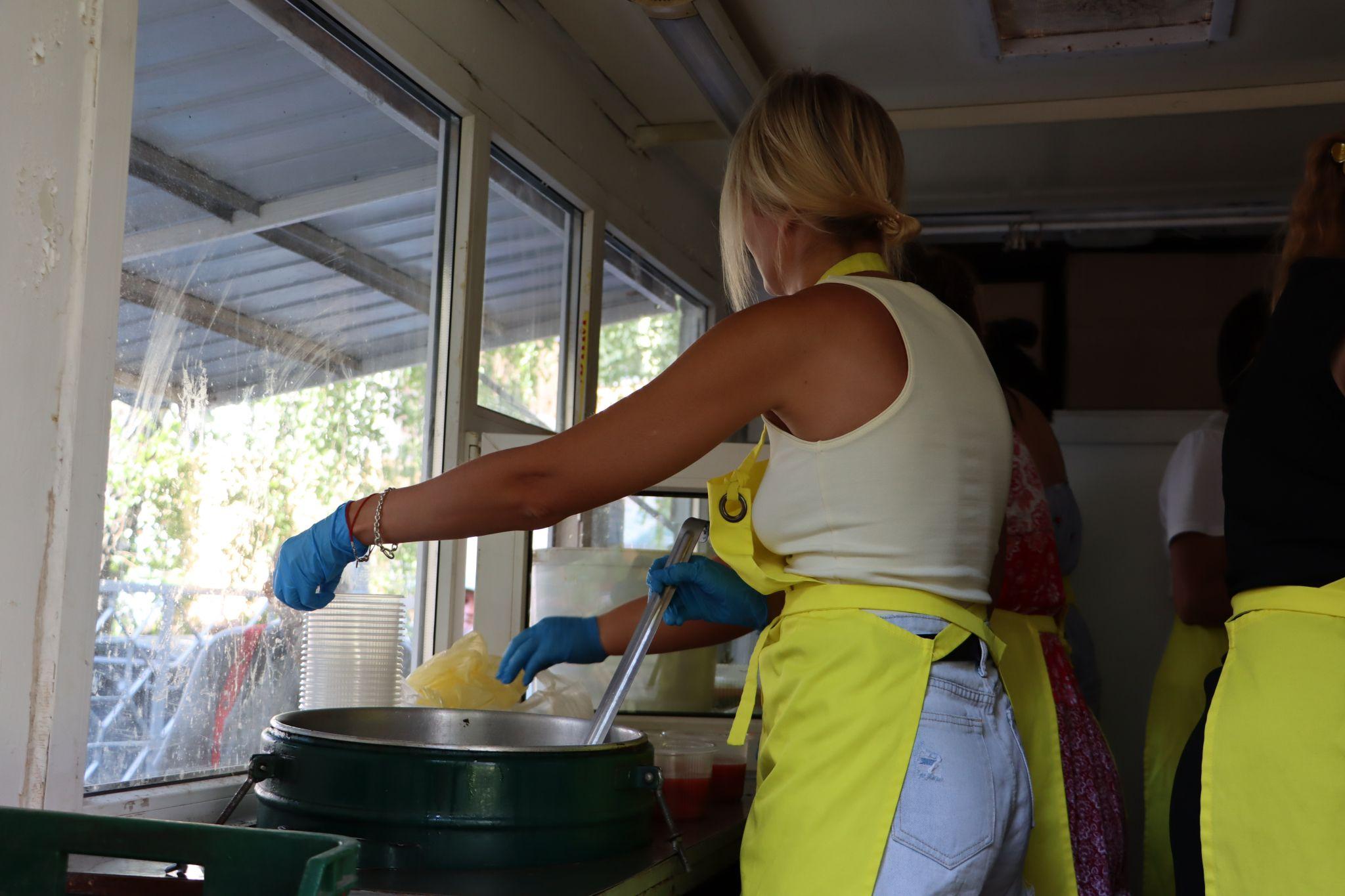Всередині жовтого автомобіля «кипить робота». Це своєрідний хаб, де готують до видачі порції їжі. Спершу туди заносять величезні каструлі з гарячою їжею, хліб, прибори та все необхідне. Кожен має свій обов’язок.