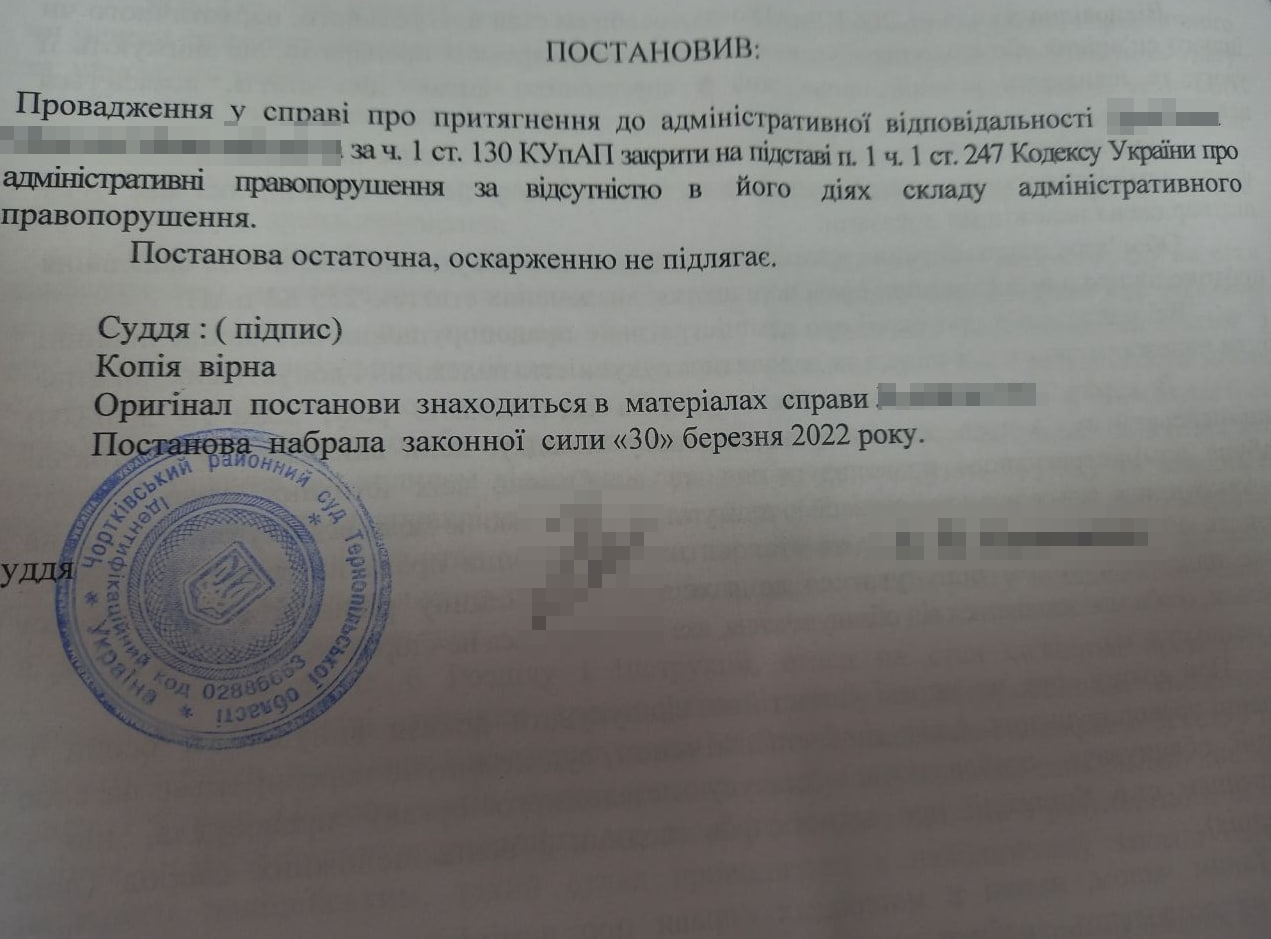 У області вже є прецедент, коли суд закрив справу по 130 статті. Зокрема, читачі надіслали фото рішення одного з судів, який закрив справу по 130 статті на підставі відсутності події і складу адміністративного правопорушення.