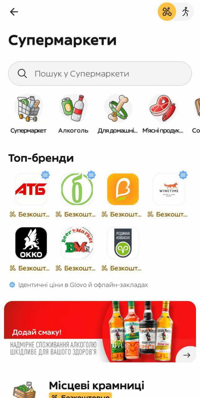 Також у деяких мережах супермаркетів при купівлі товарів на певну суму вартість доставки через Glovo буде безкоштовна. Для цього треба зробити мінімальне замовлення на 70 гривень. Ця пропозиція діє для супермаркетів «Рукавичка», «АТБ», «Близенько», «Родинна ковбаска», «Рошен», Winetime.
