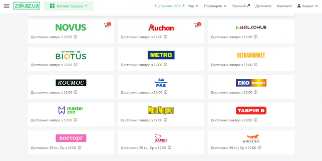 Ще один спосіб замовити продукти – через сайт zakaz.ua. Там доступні різні мережі супермаркетів. Однак доставка відбувається «Новою поштою». Товар можуть відправити до поштомату біля вашого дому або можна оформити доставку кур’єром.
