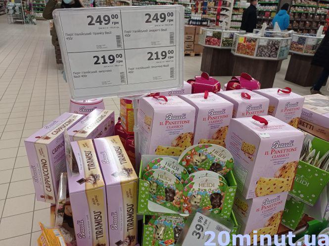 На окремих стелажах виставили італійські пироги. Вагою 400 грамів обійдеться в 219 гривень, 450 грамів – 249 гривень. Такі мають смак тірамісу, капучіно, тощо.