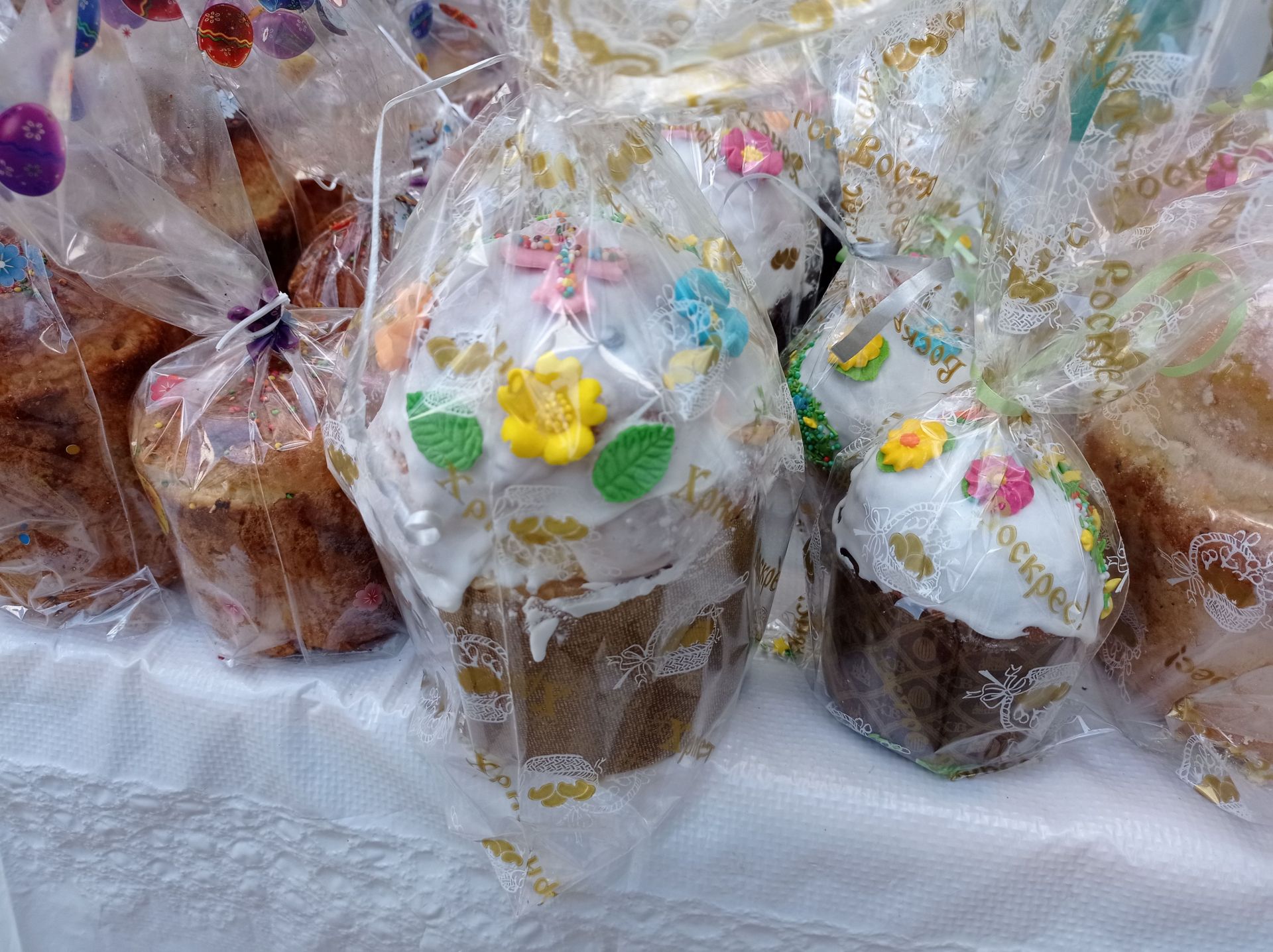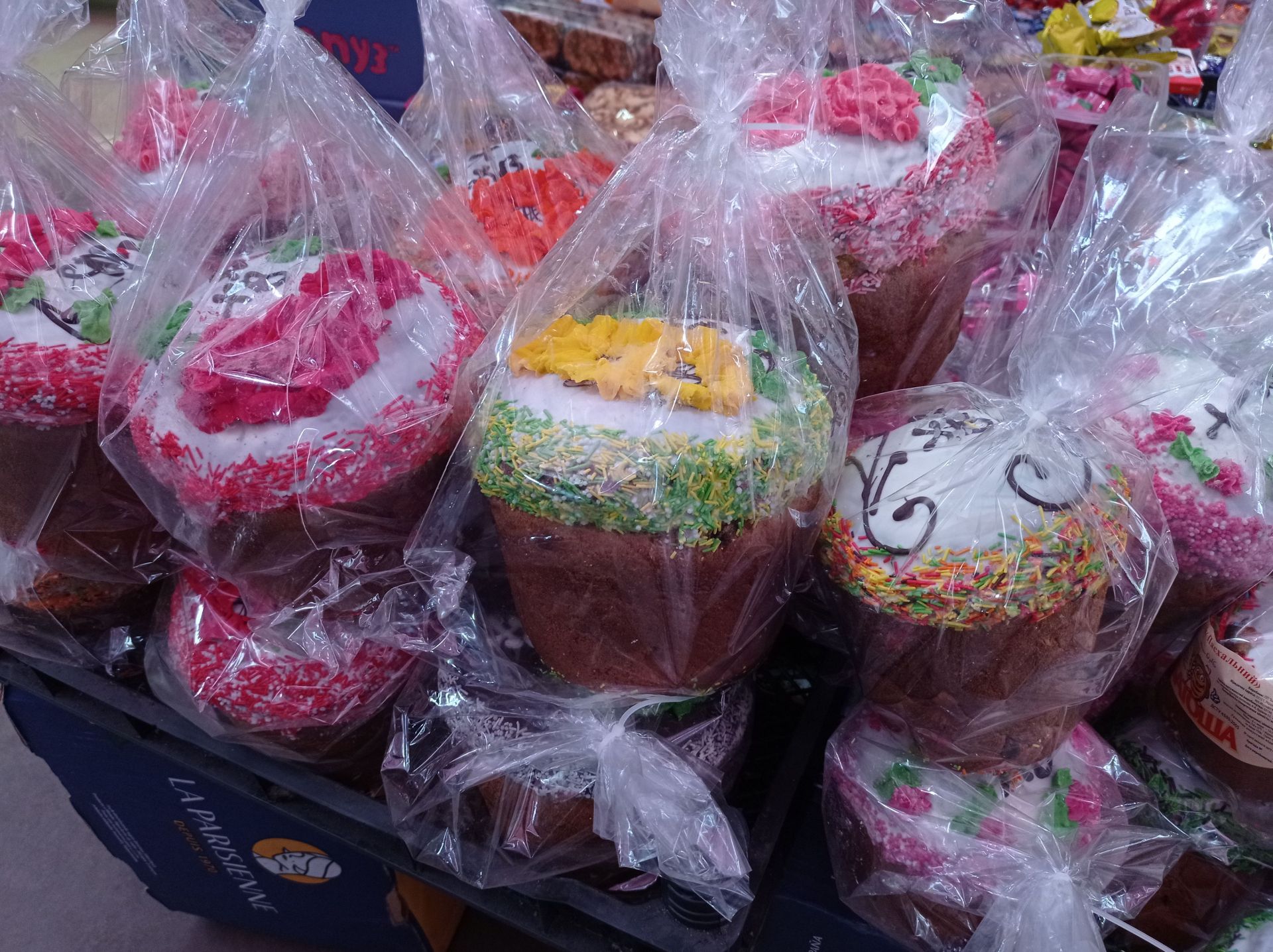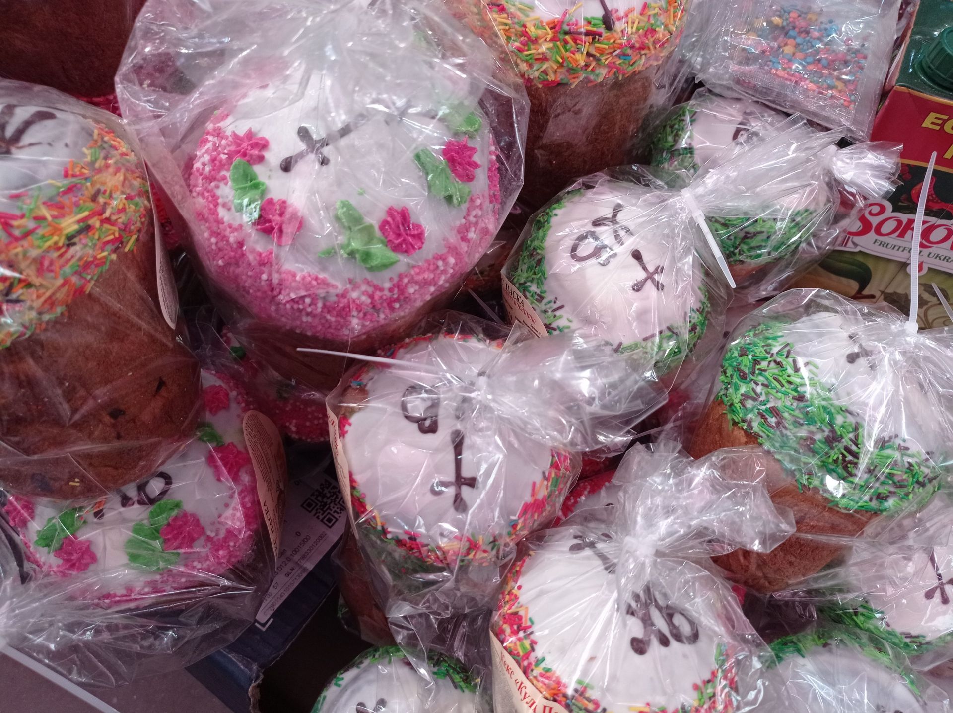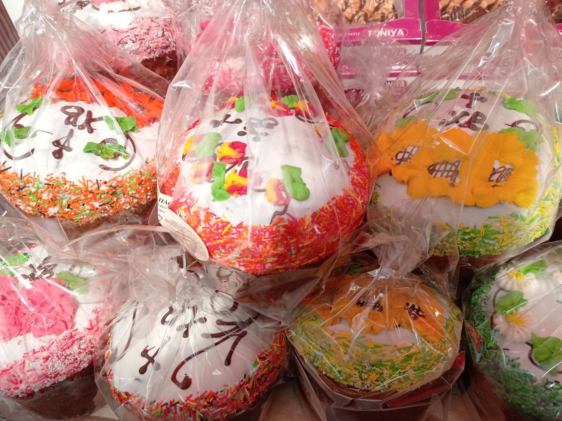 Є паски прикрашені цукровою присипкою, квітами та написами.