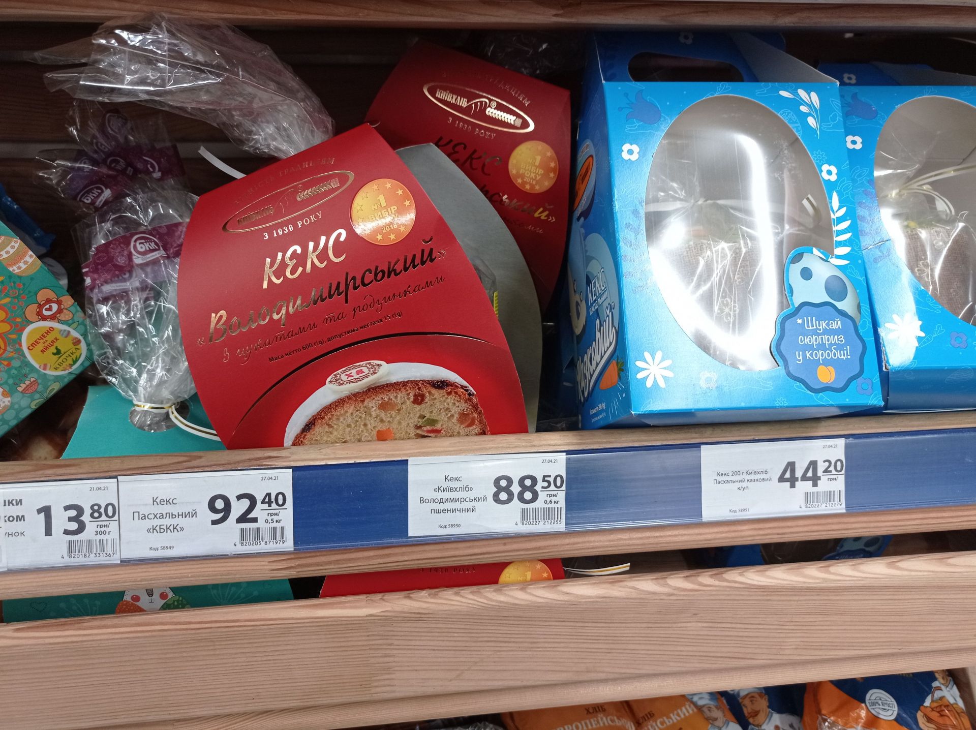 У «АТБ» пасхальні кекси від різних виробників. Кекс «Київхліб» вагою 200 грамів коштує 44,2 грн. Вагою 600 грамів, від цього ж виробника – 88,5 грн. Кекс від «КБКК» вагою 500 грамів коштує 92,4 грн.