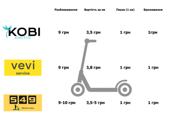 Вартість розблокування самокату становить 9 грн. Одна хвилина поїздки – 3,5 грн. Бронювання або пауза під час поїздки коштує 1 грн за хвилину.