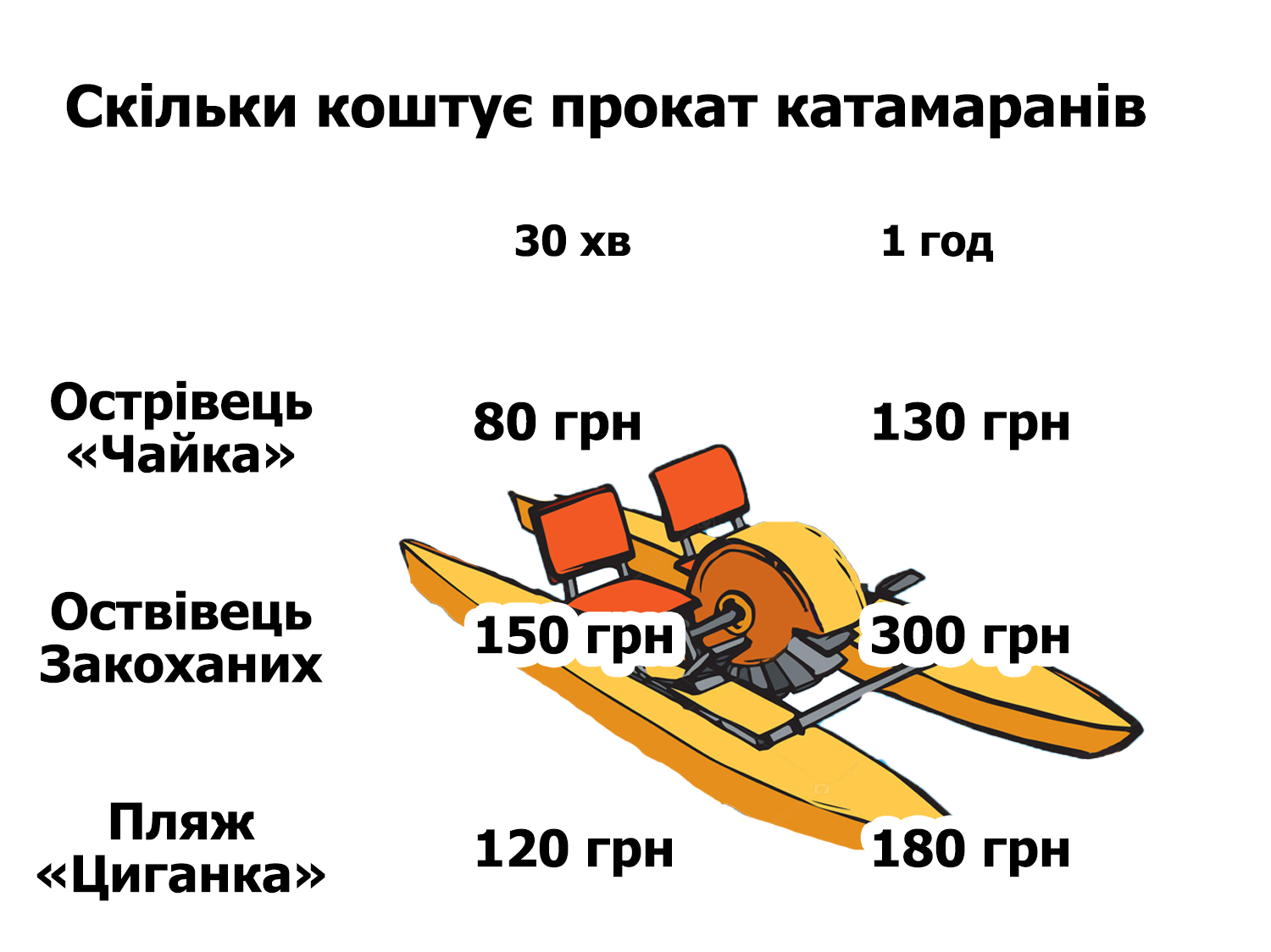 На «Остівці закоханих» катамарани найдорожчі. 30 хвилин коштує 150 гривень, година – 300 гривень. Працюють вони з 12:00 до 21:00, але графік може змінюватися, залежно від погодних умов.