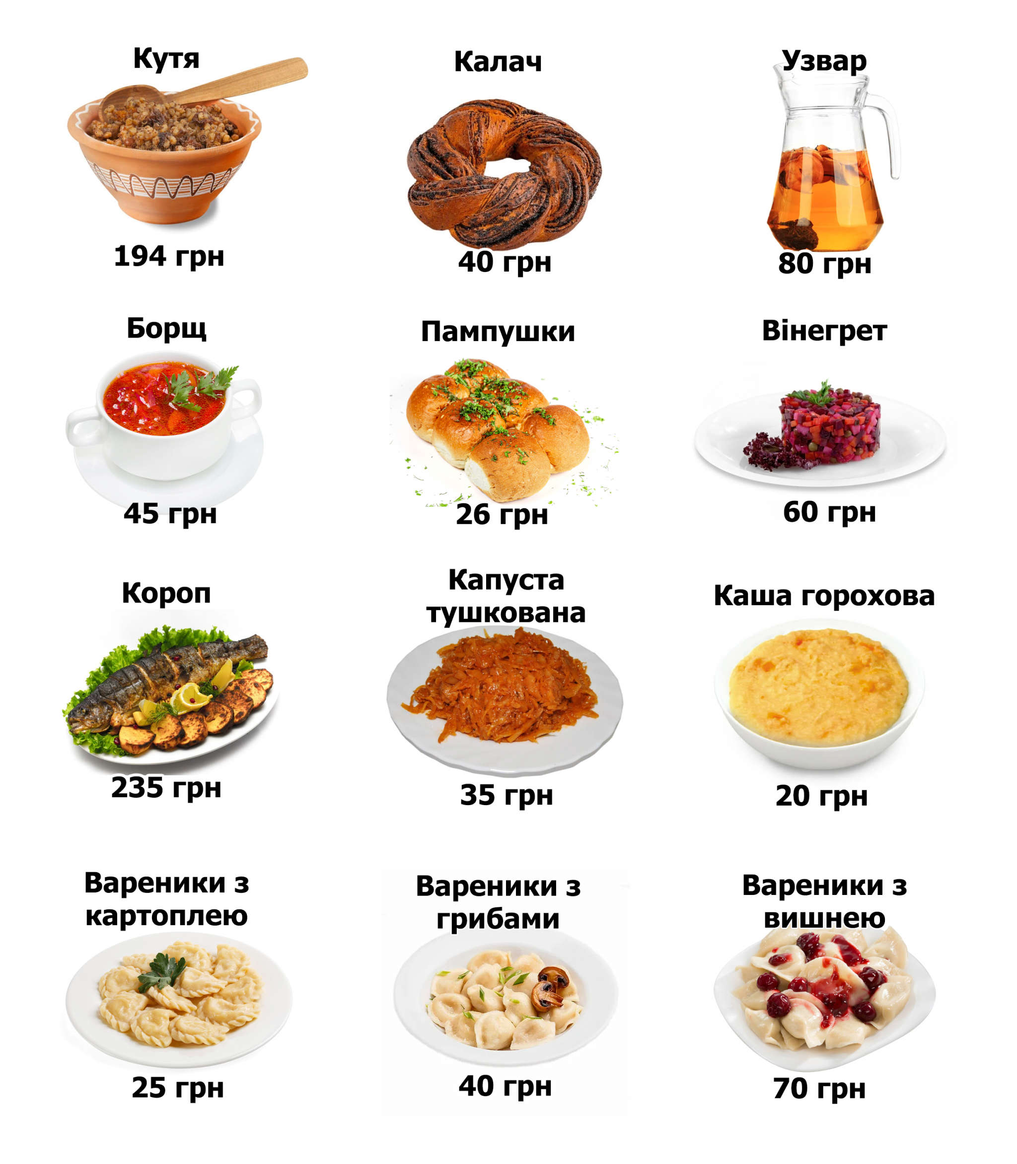 Журналісти «RIA плюс» склали список страв. У кожної родини вони можуть відрізнятися. Крім куті ми порахували вартість – вареників з картоплею, картоплею та грибами, вишнею. Також додали витрати на пісний борщ, вінегрет, запечений короп, горохову кашу, тушковану капусту, пампушки, калач з маком та узвар.