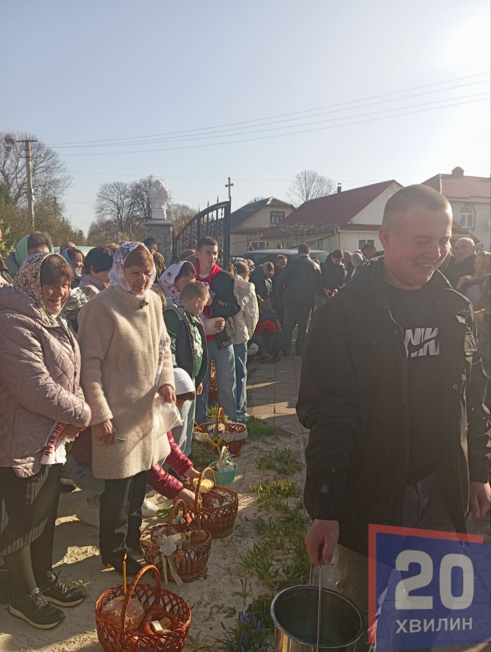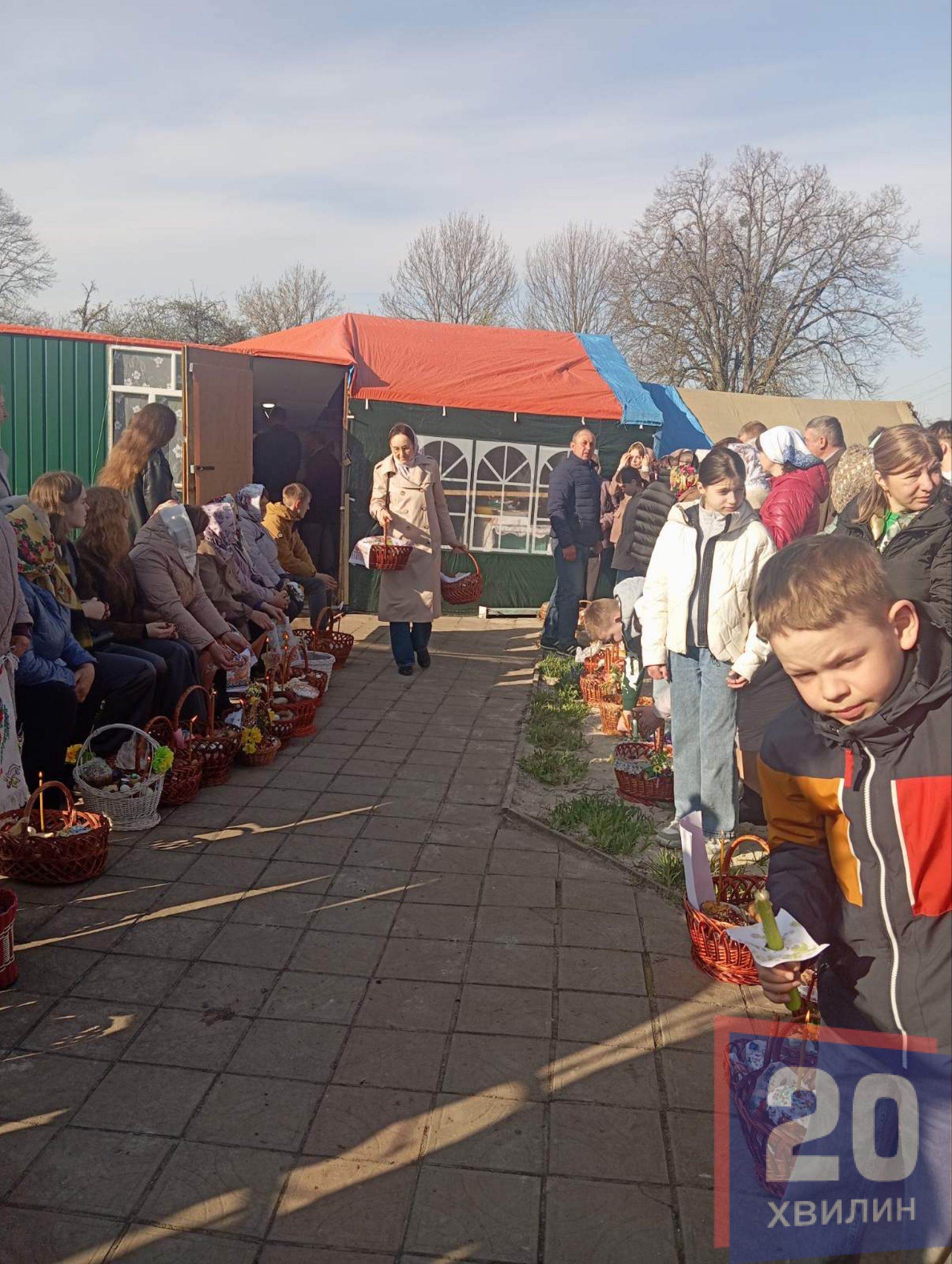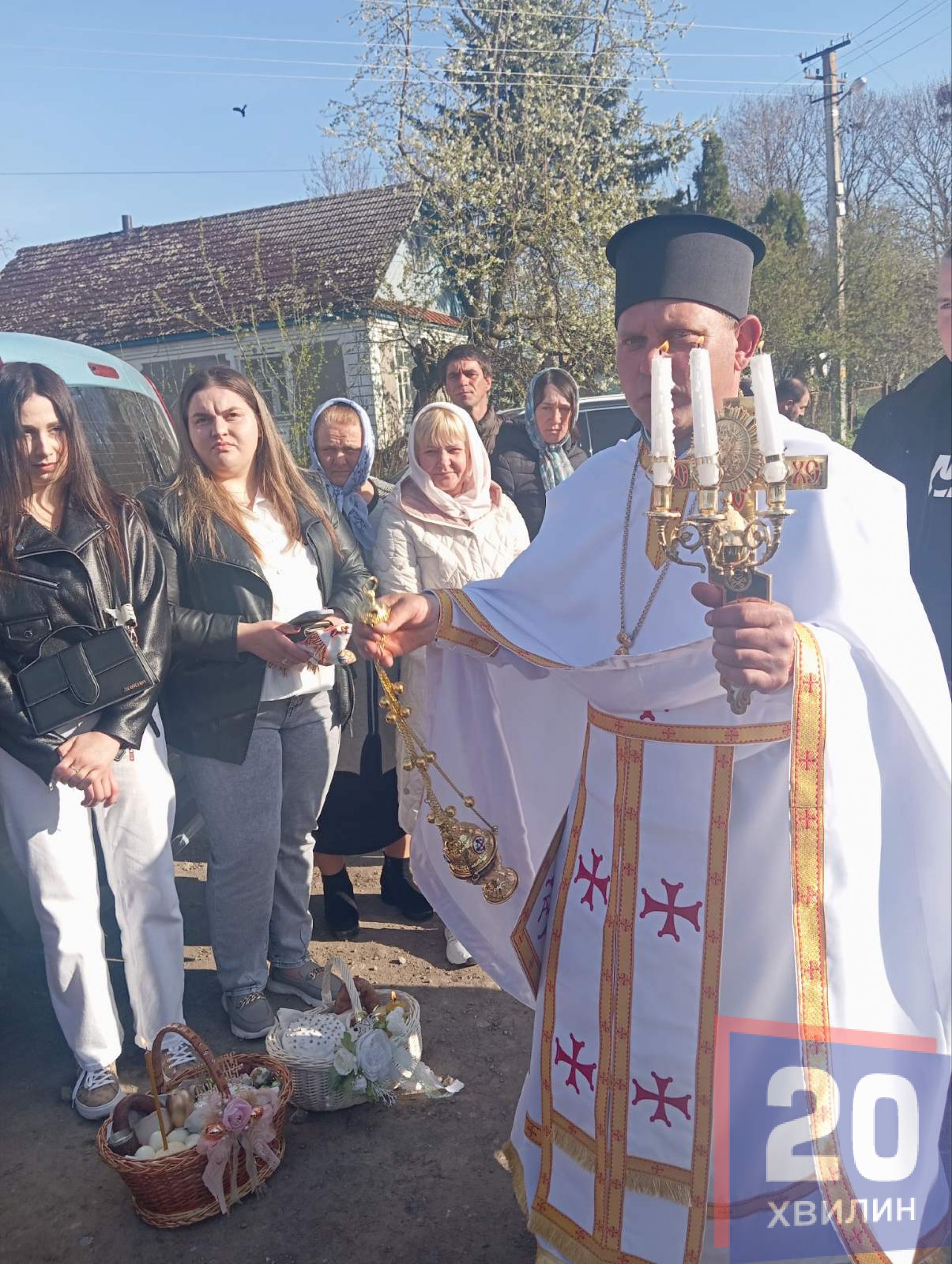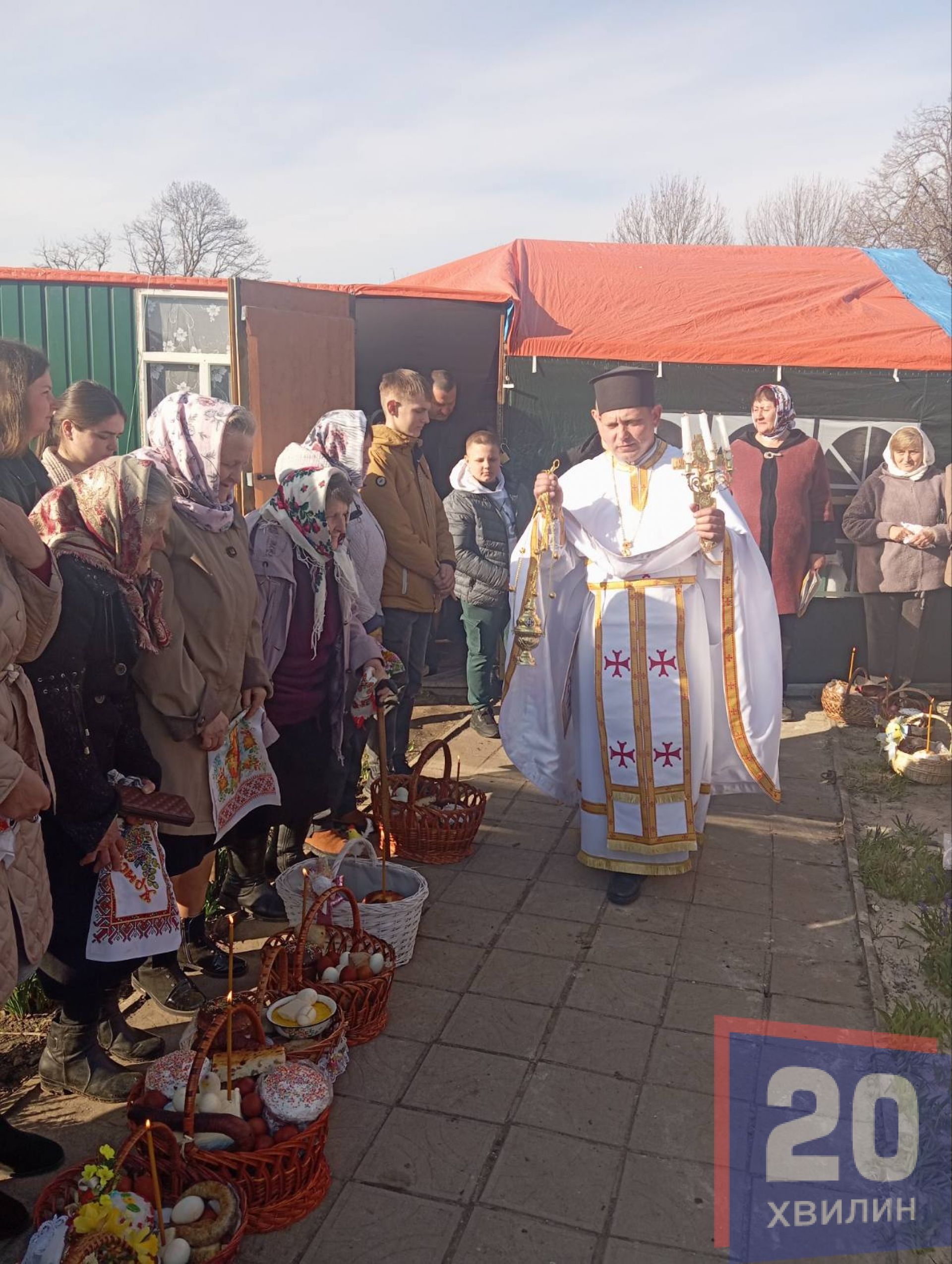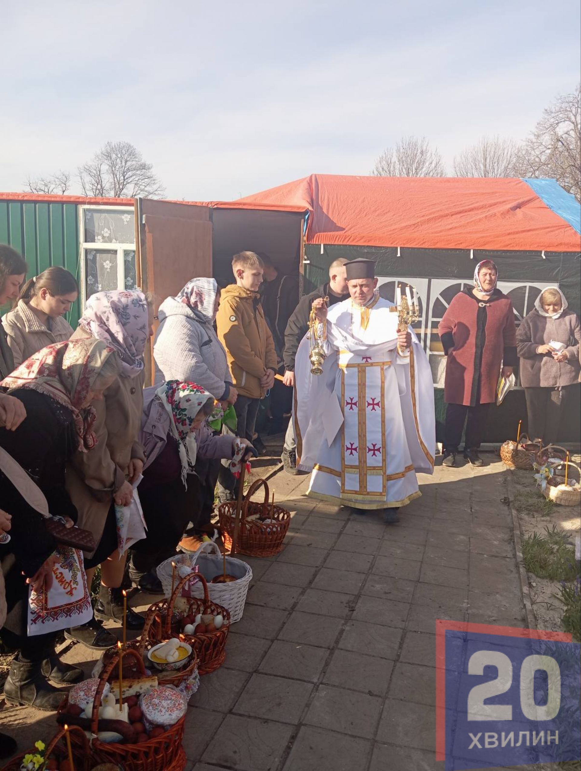 Великодні кошики освятили на церковному подвір’ї просто неба у с. Катеринівка, що на Кременеччині, де місяць тому вщент згорів храм.