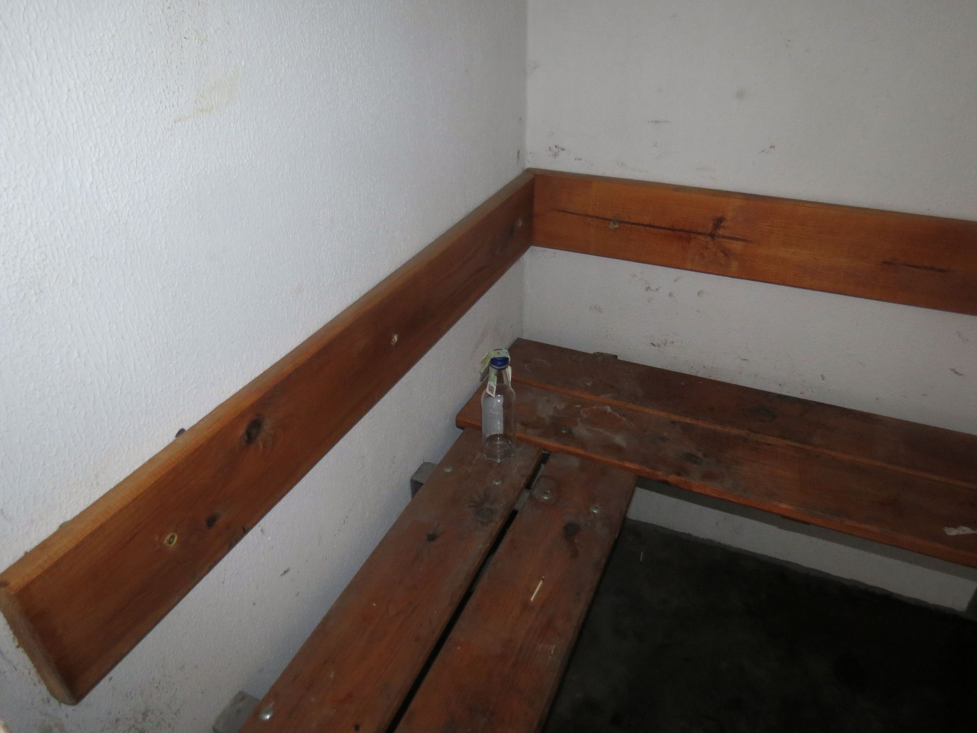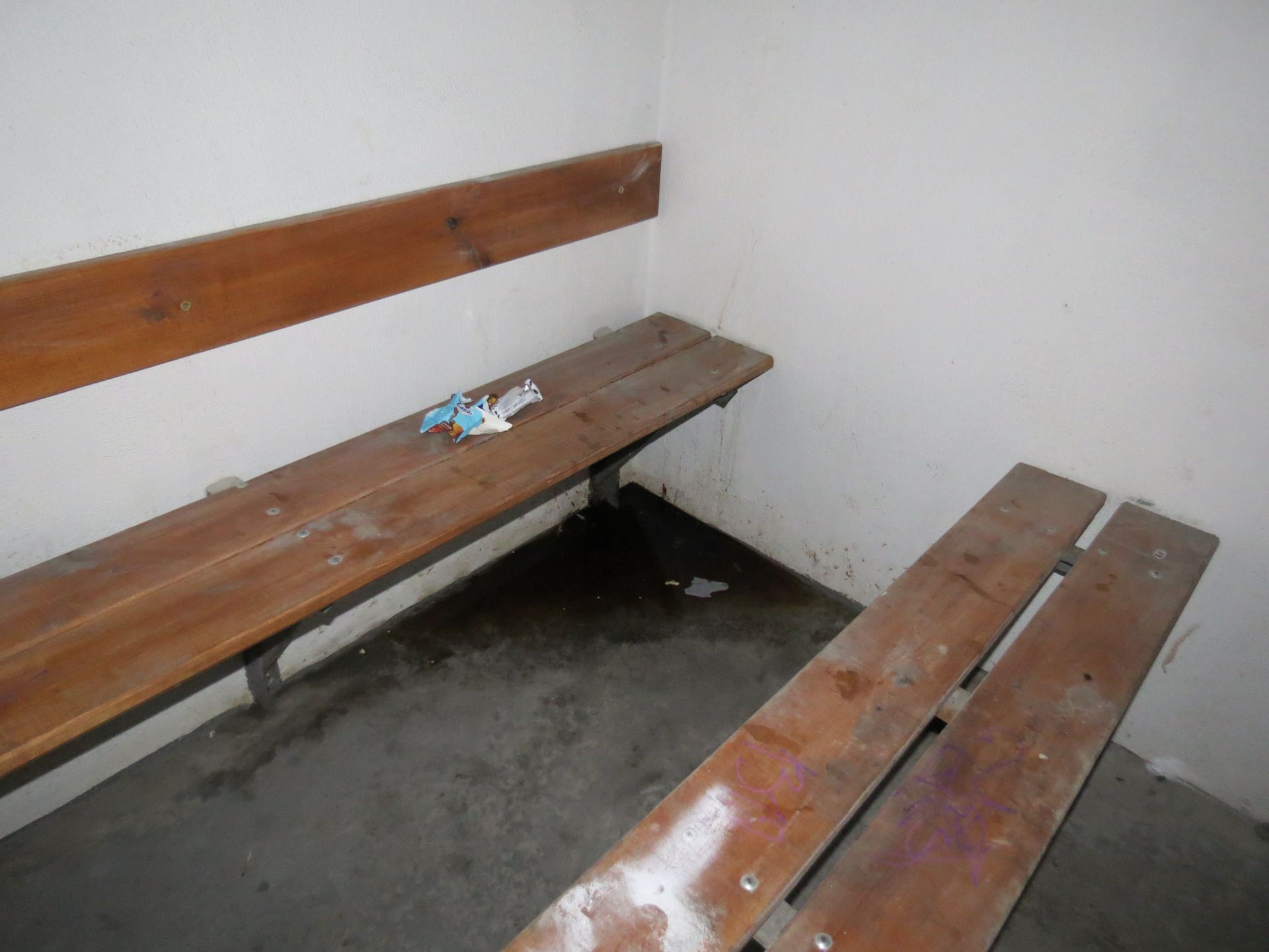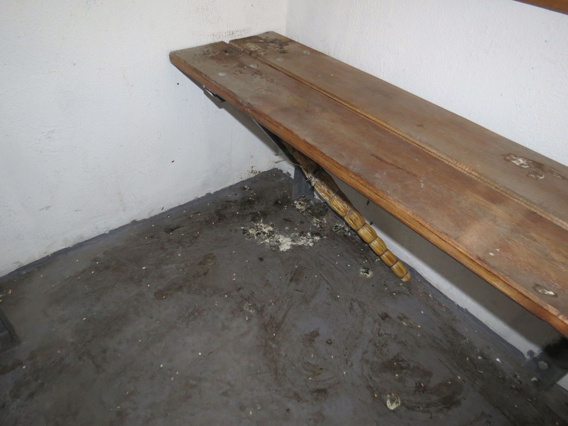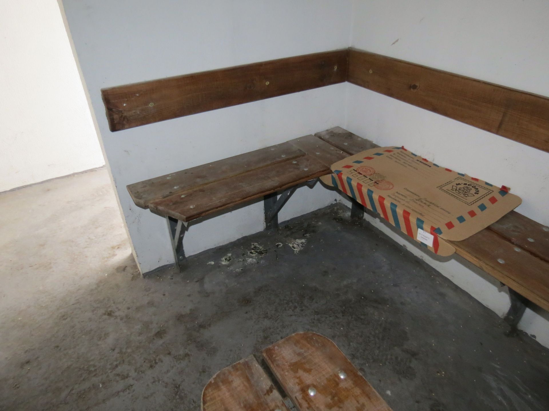 В укритті біля лікарні хтось поклав картон на лавку, щоб не забруднити одяг, бо вони були брудні. На підлозі – зерно. Можливо, хтось годував голубів, бо всередині на підлозі пташиний послід. Запах – відповідний.