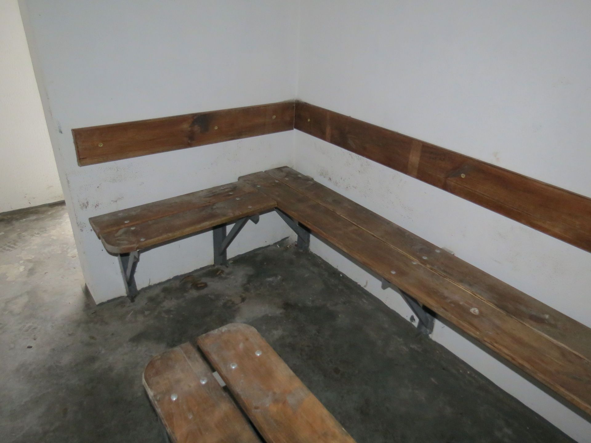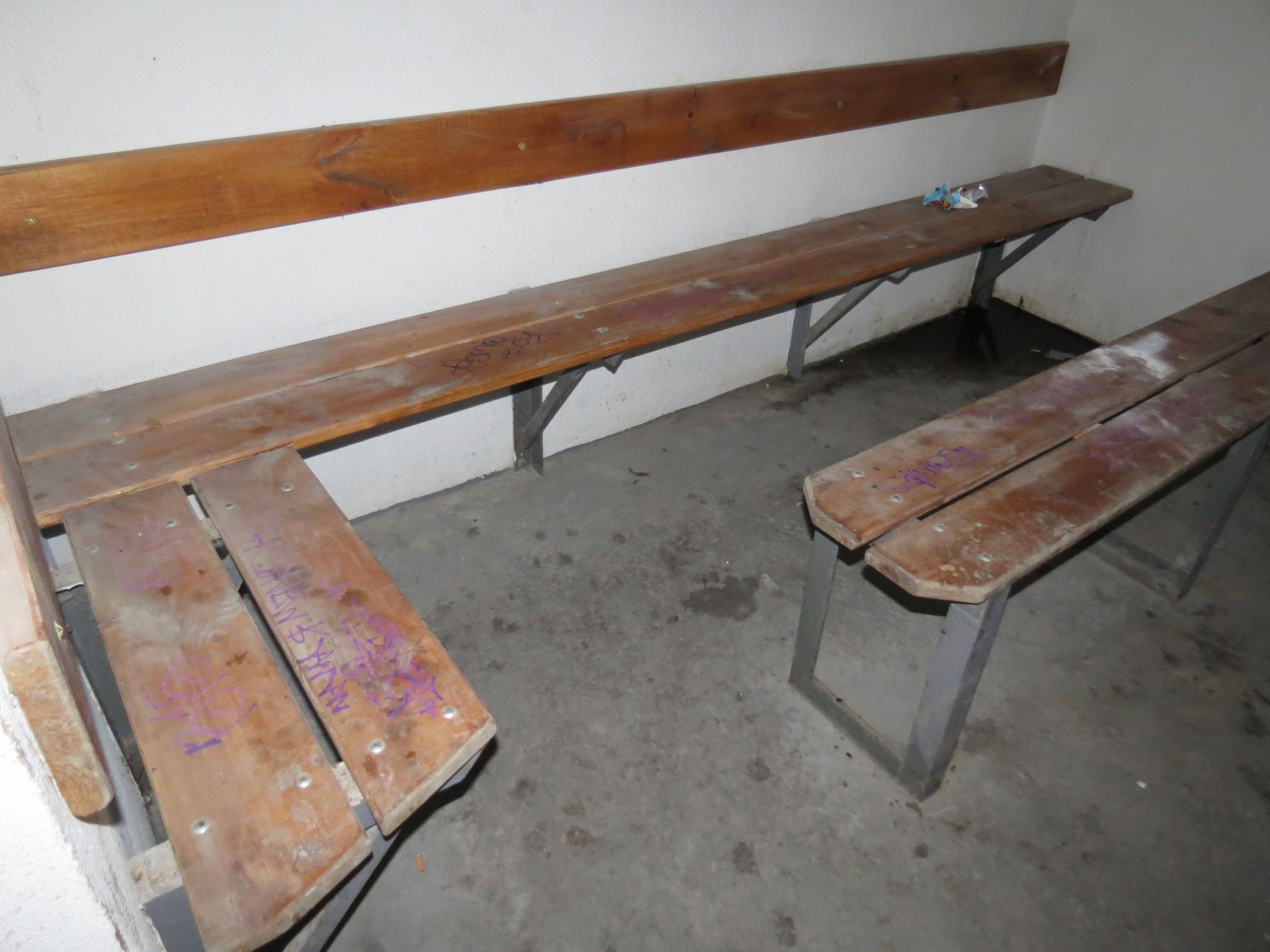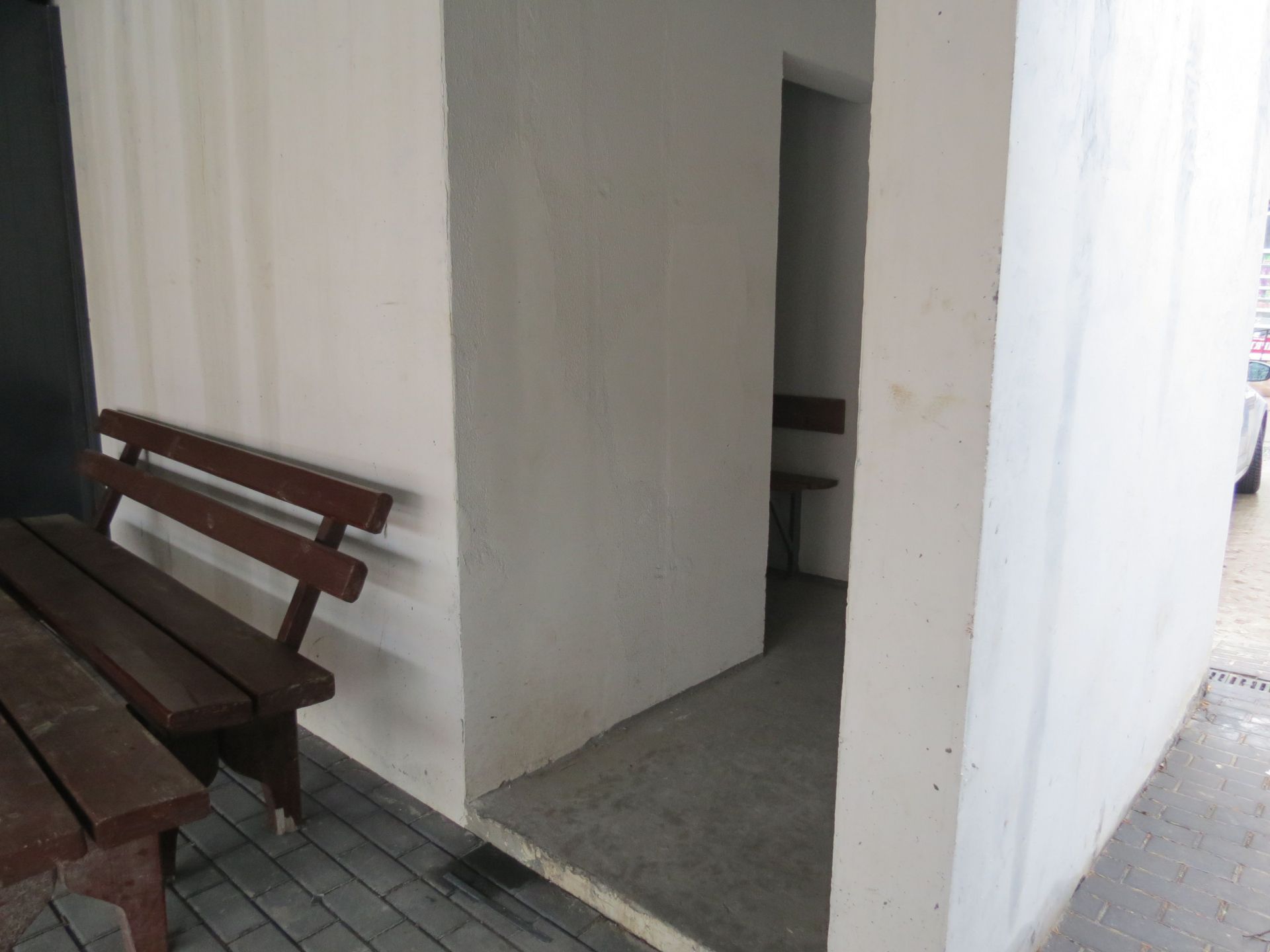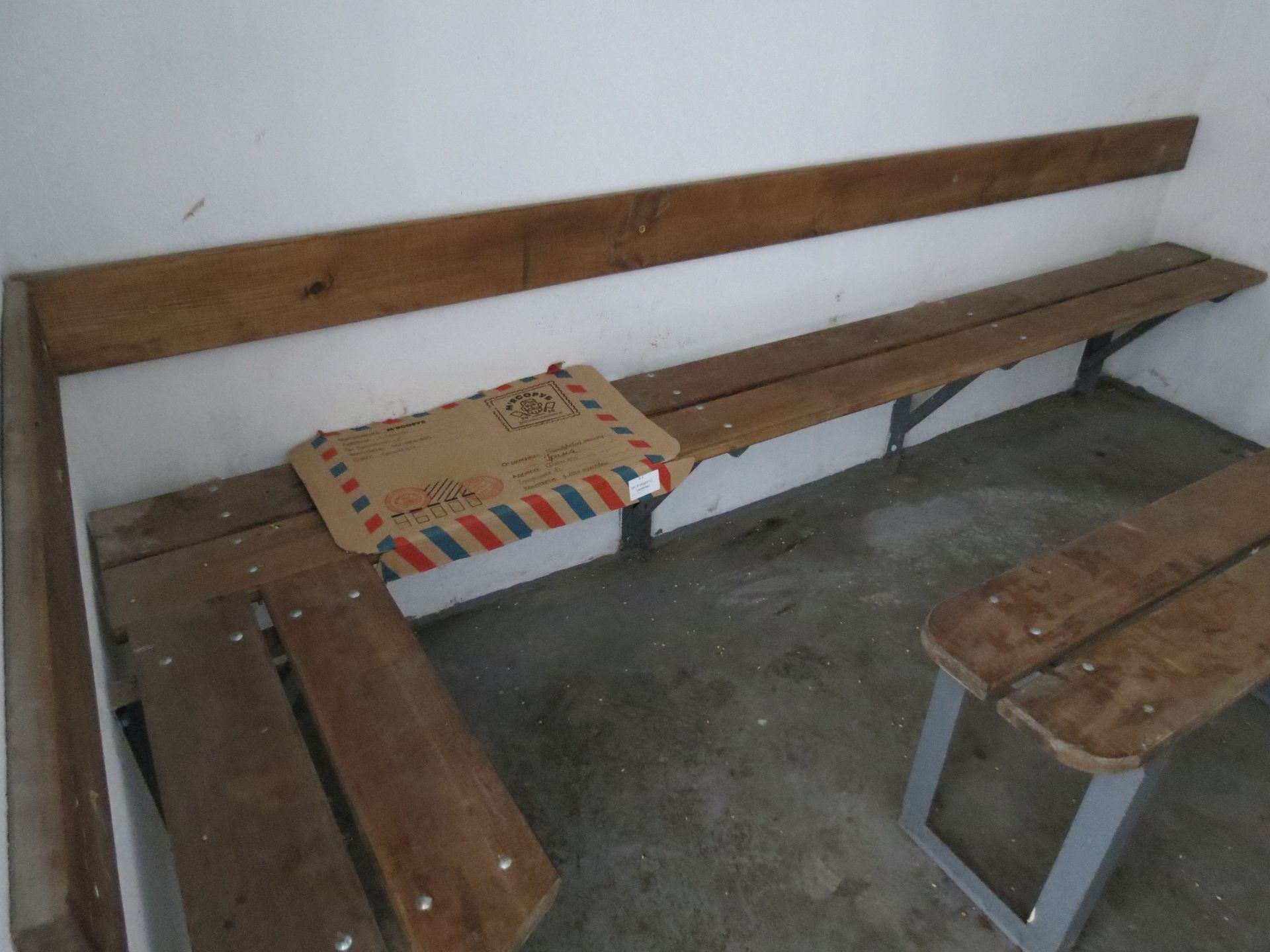 В укритті біля лікарні хтось поклав картон на лавку, щоб не забруднити одяг, бо вони були брудні. На підлозі – зерно. Можливо, хтось годував голубів, бо всередині на підлозі пташиний послід. Запах – відповідний.