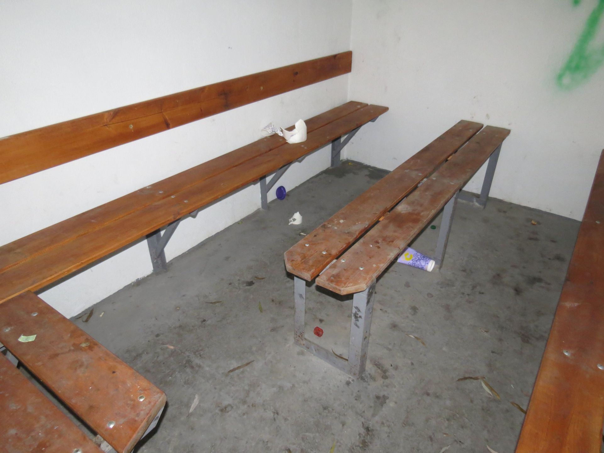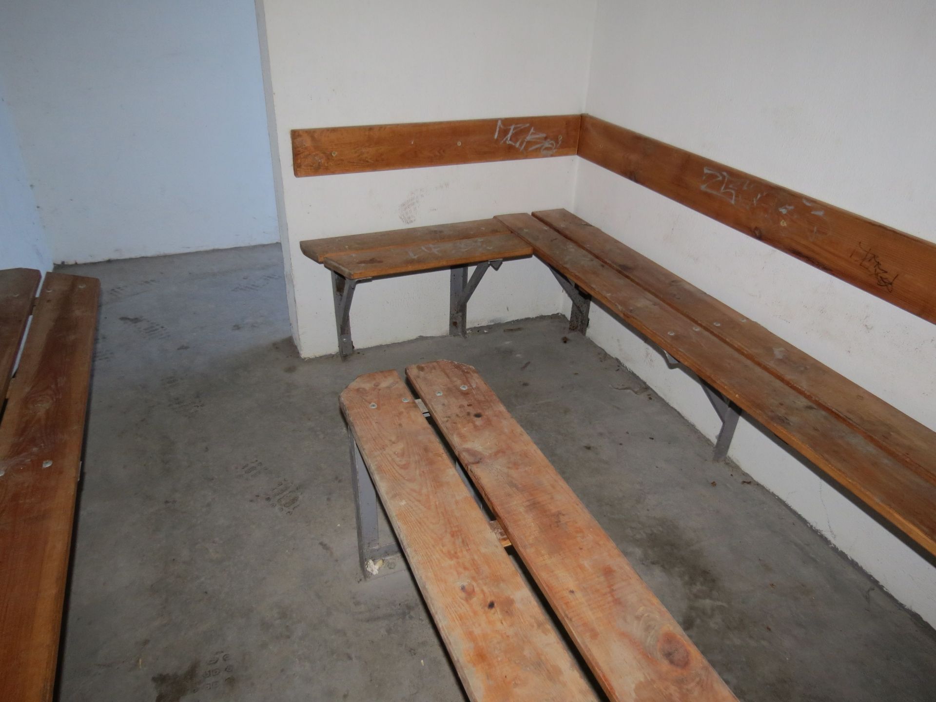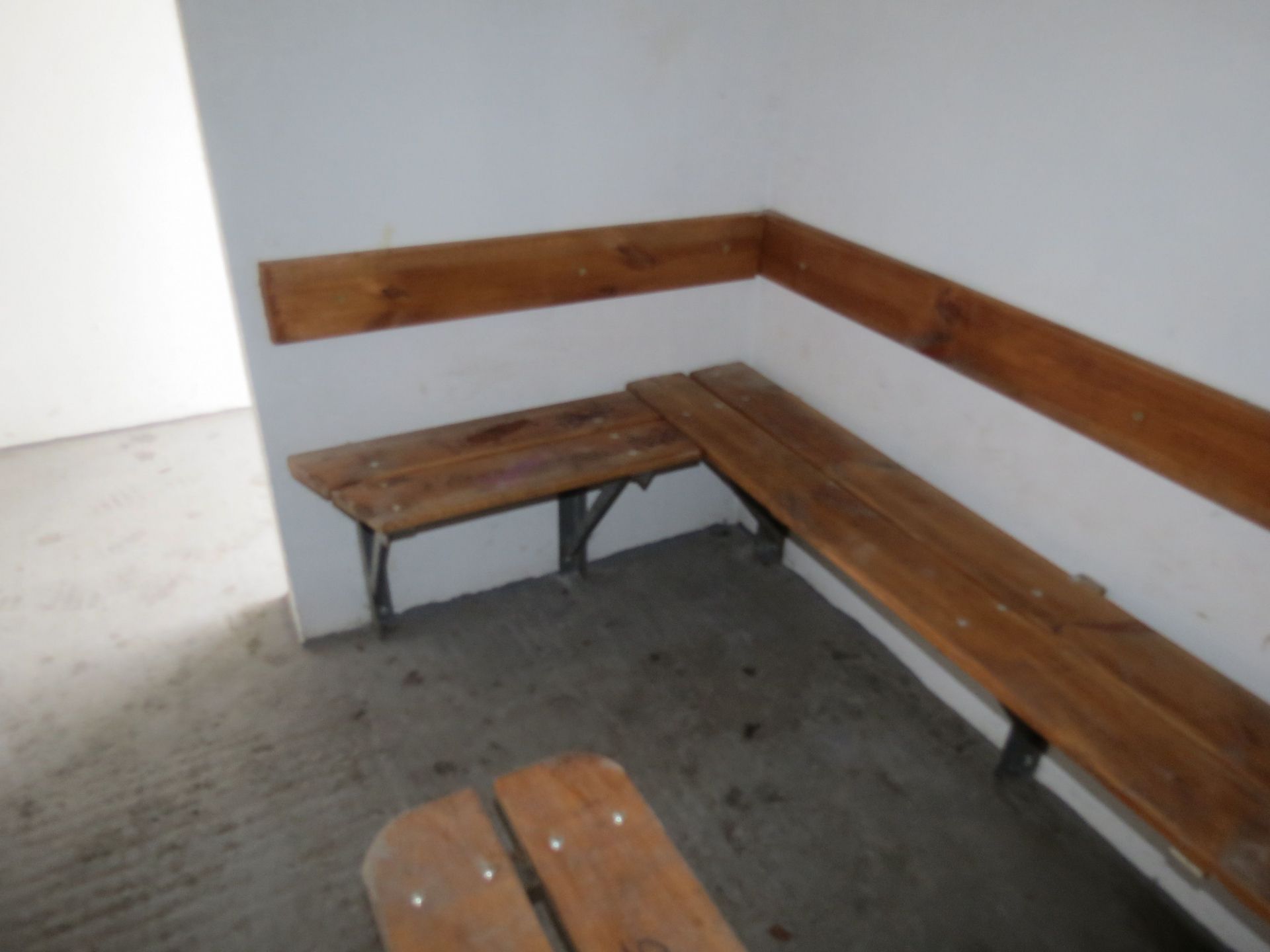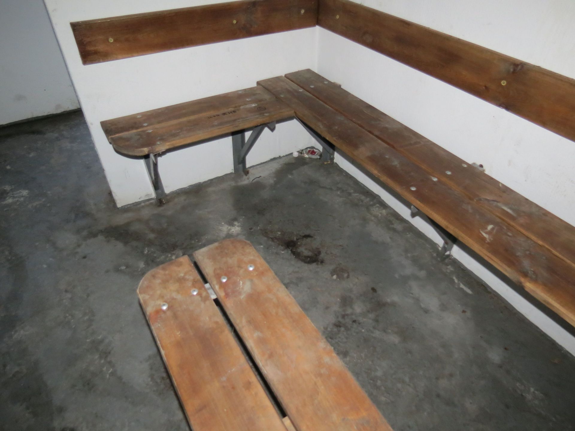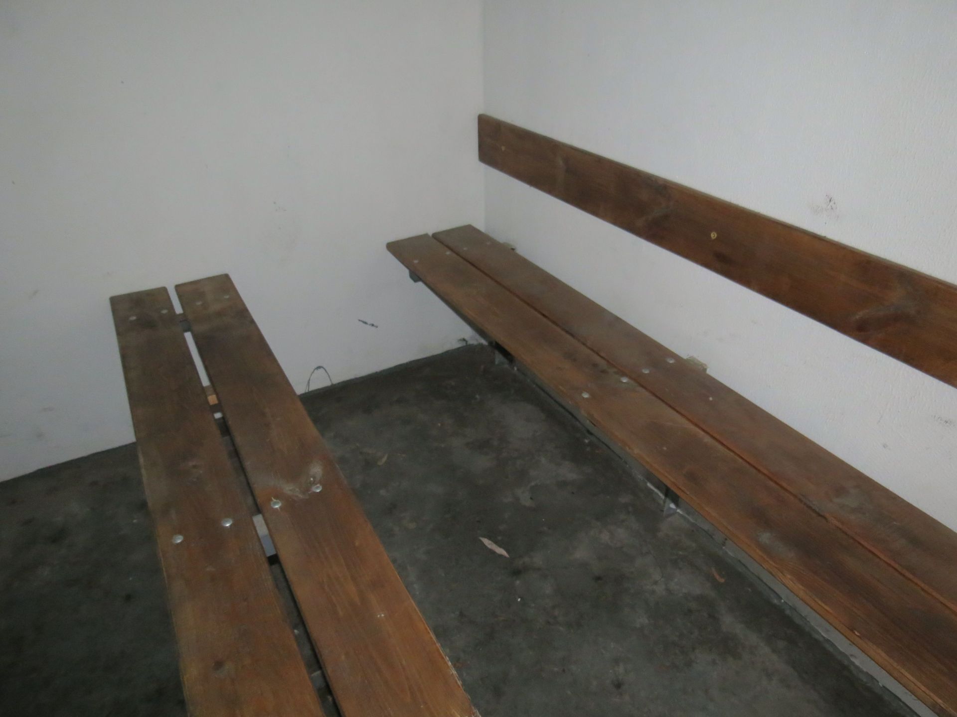 В укритті біля лікарні хтось поклав картон на лавку, щоб не забруднити одяг, бо вони були брудні. На підлозі – зерно. Можливо, хтось годував голубів, бо всередині на підлозі пташиний послід. Запах – відповідний.