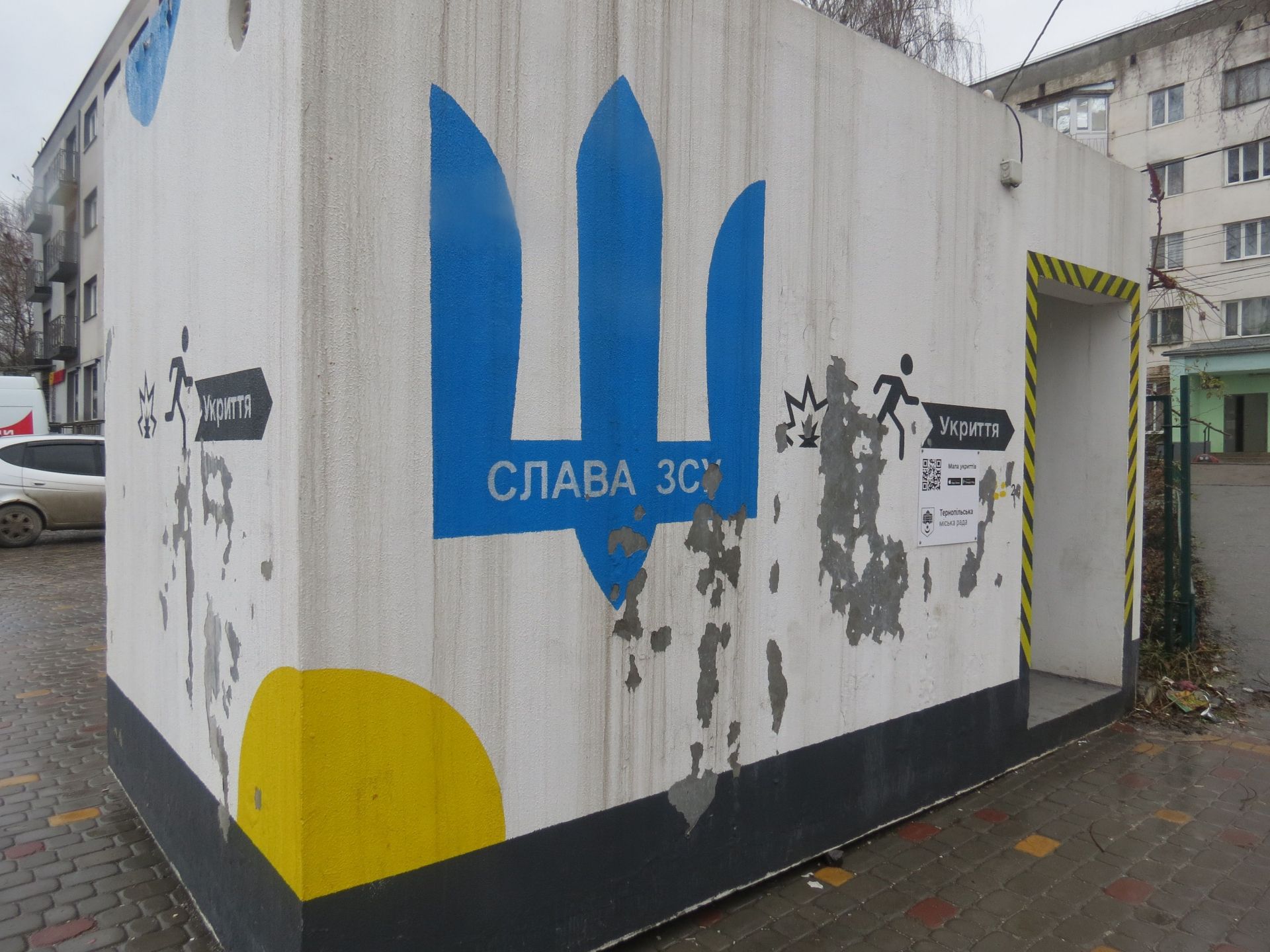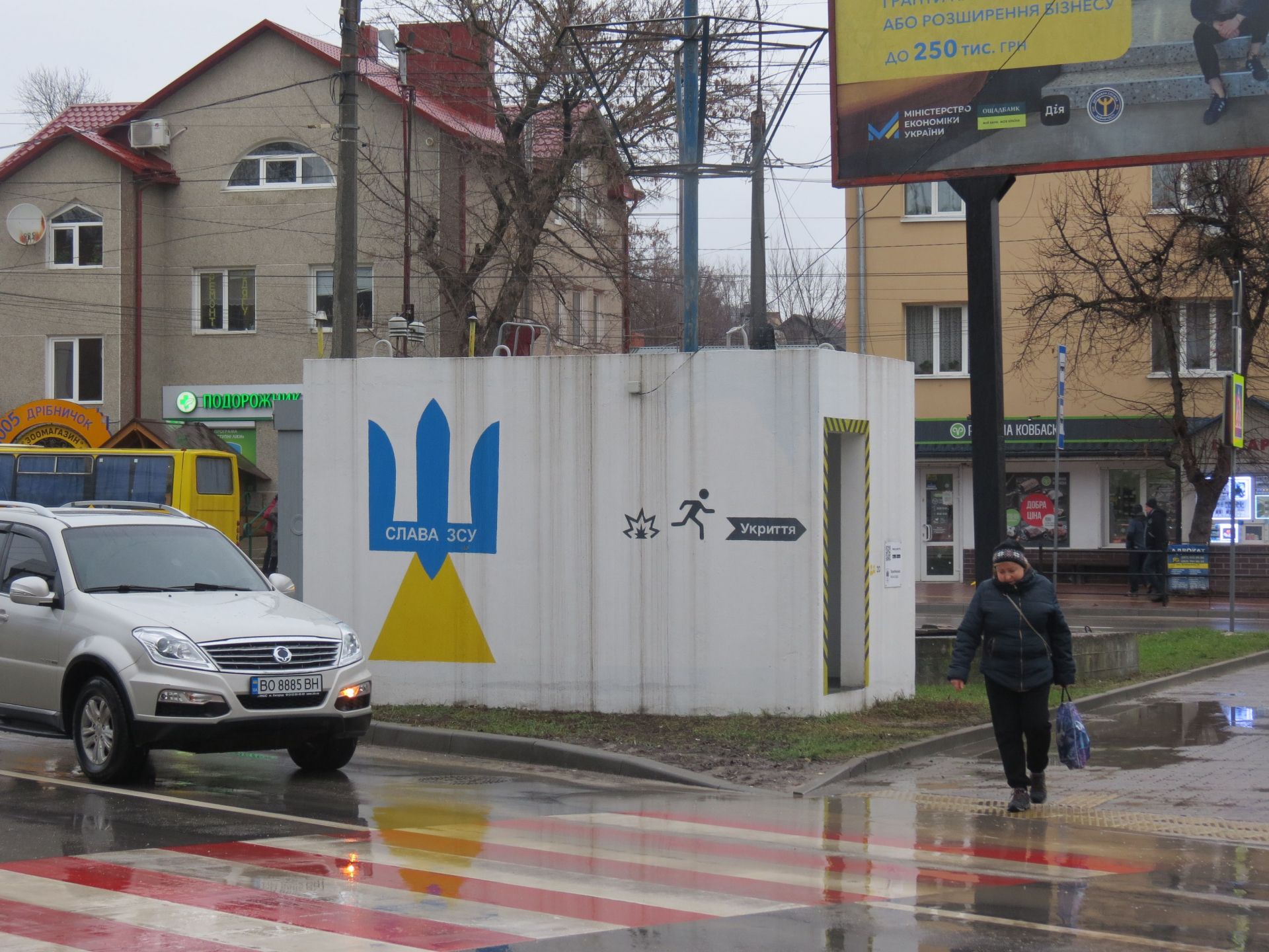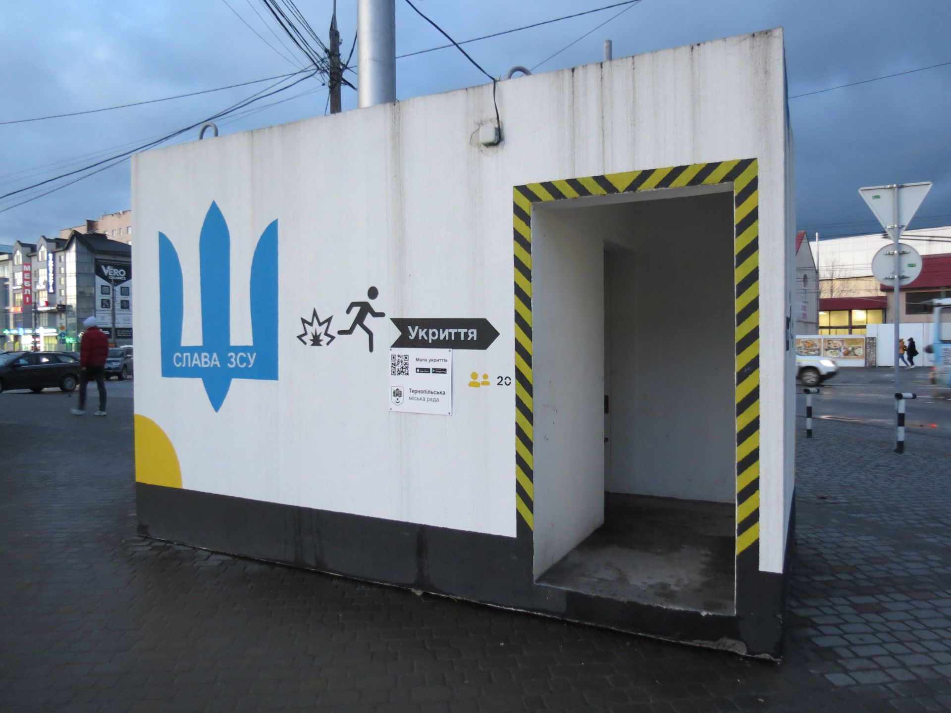 Це укриття тепер знаходиться поміж нових МАФів, які встановлюють неподалік Збаразького кільця. Фасад укриття також відновлював підрядник, оскільки штукатурка обсипалась. Однак малюнки, як на інших мобільних захисних спорудах, не відновили, а лише заштукатурили стіни. Всередині – брудні лавки, сміття та калюжа у кутку. Але неприємного запаху ми не відчули.
