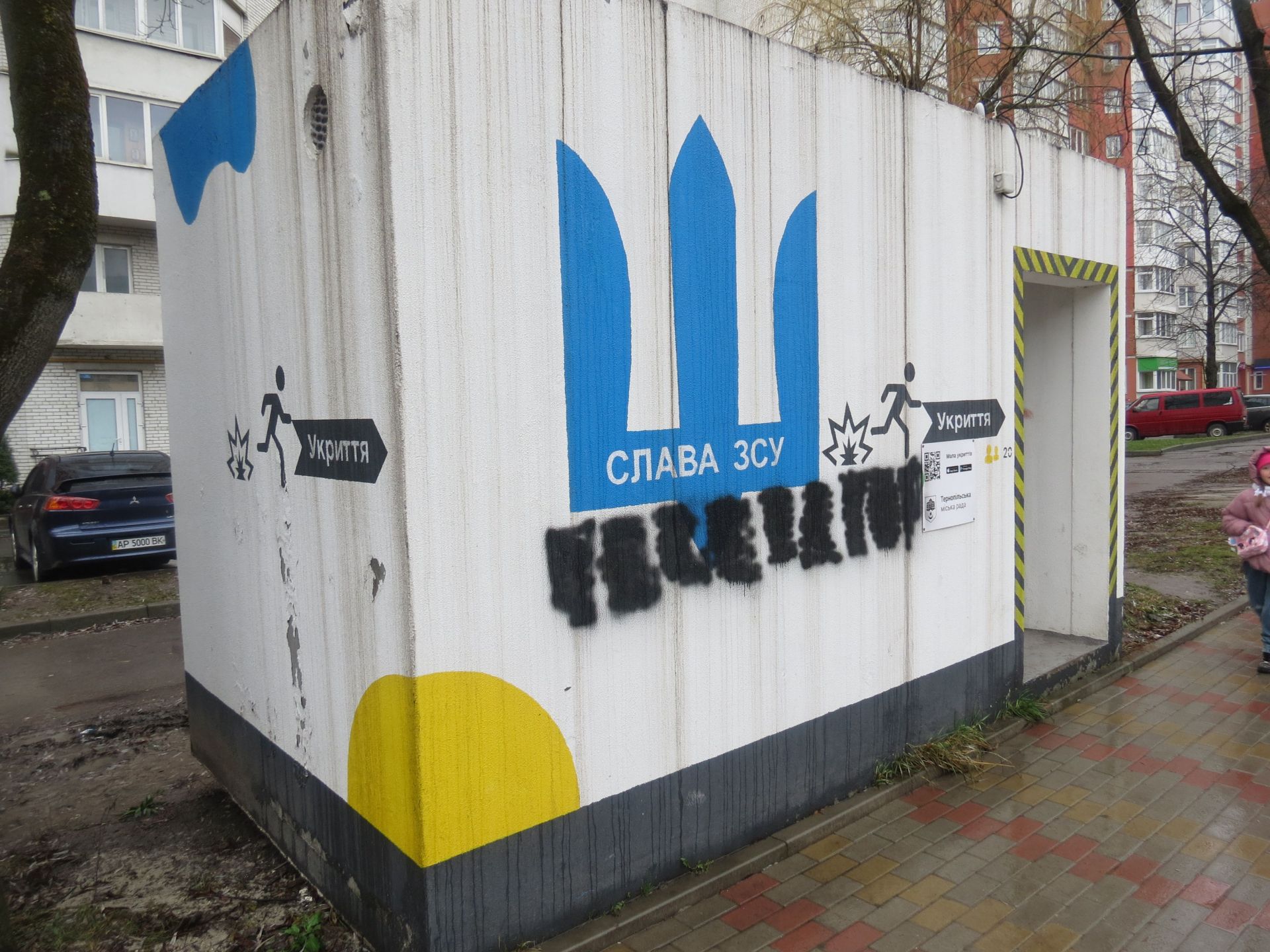 На укритті написали посилання на телеграм-канал, де поширюють заборонені речовини. Його замалювали чорною фарбою. В деяких місцях відшаровується штукатурка. Всередині – брудні лавки та калюжа в кутку.