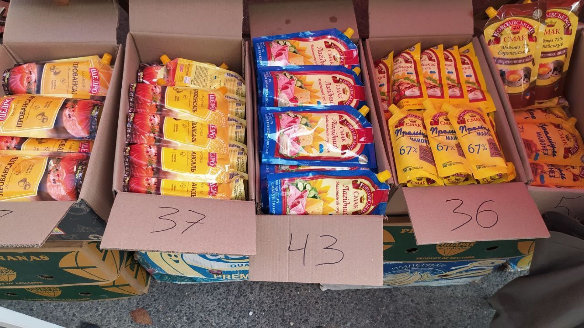 Представлена на ярмарку і бакалія. Наприклад, олія соняшникова 5 л по 200 і 230 грн, є масло від 130 до 345 грн, майонези, крупи. Також продають соняшник – по 15 грн.