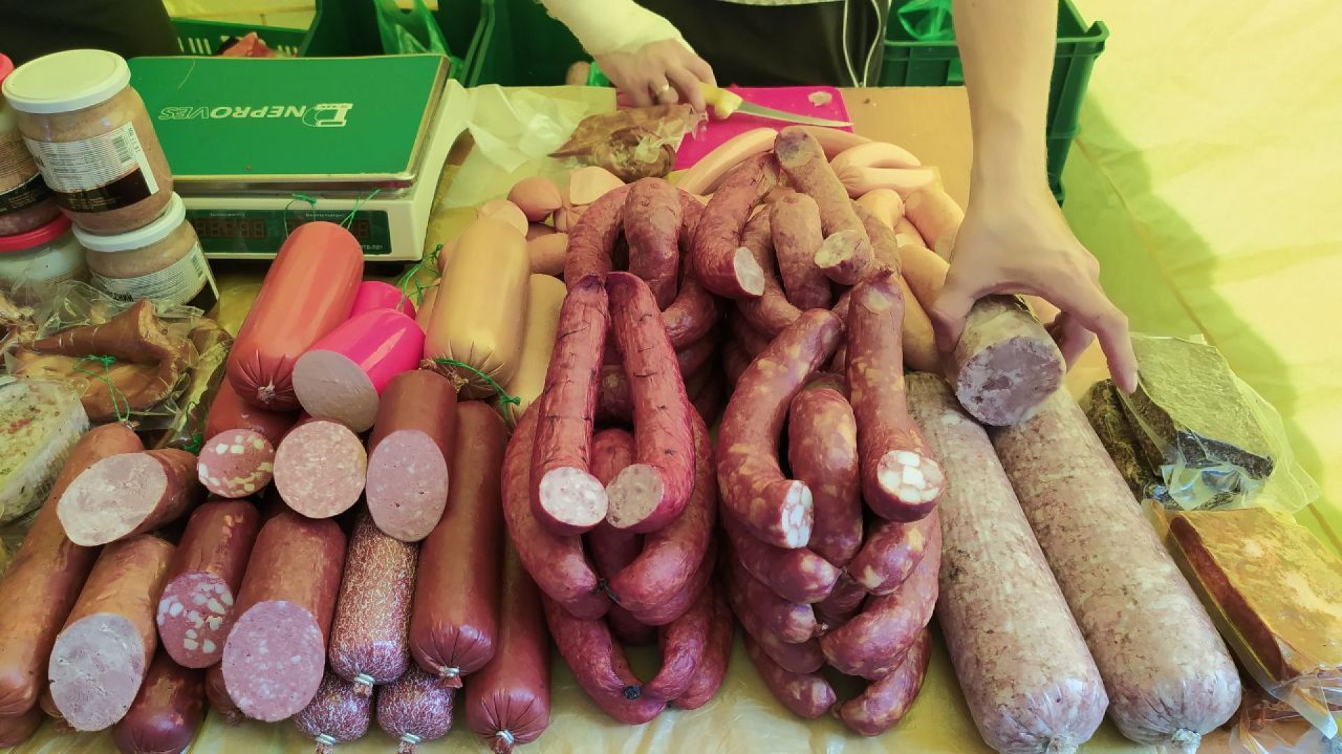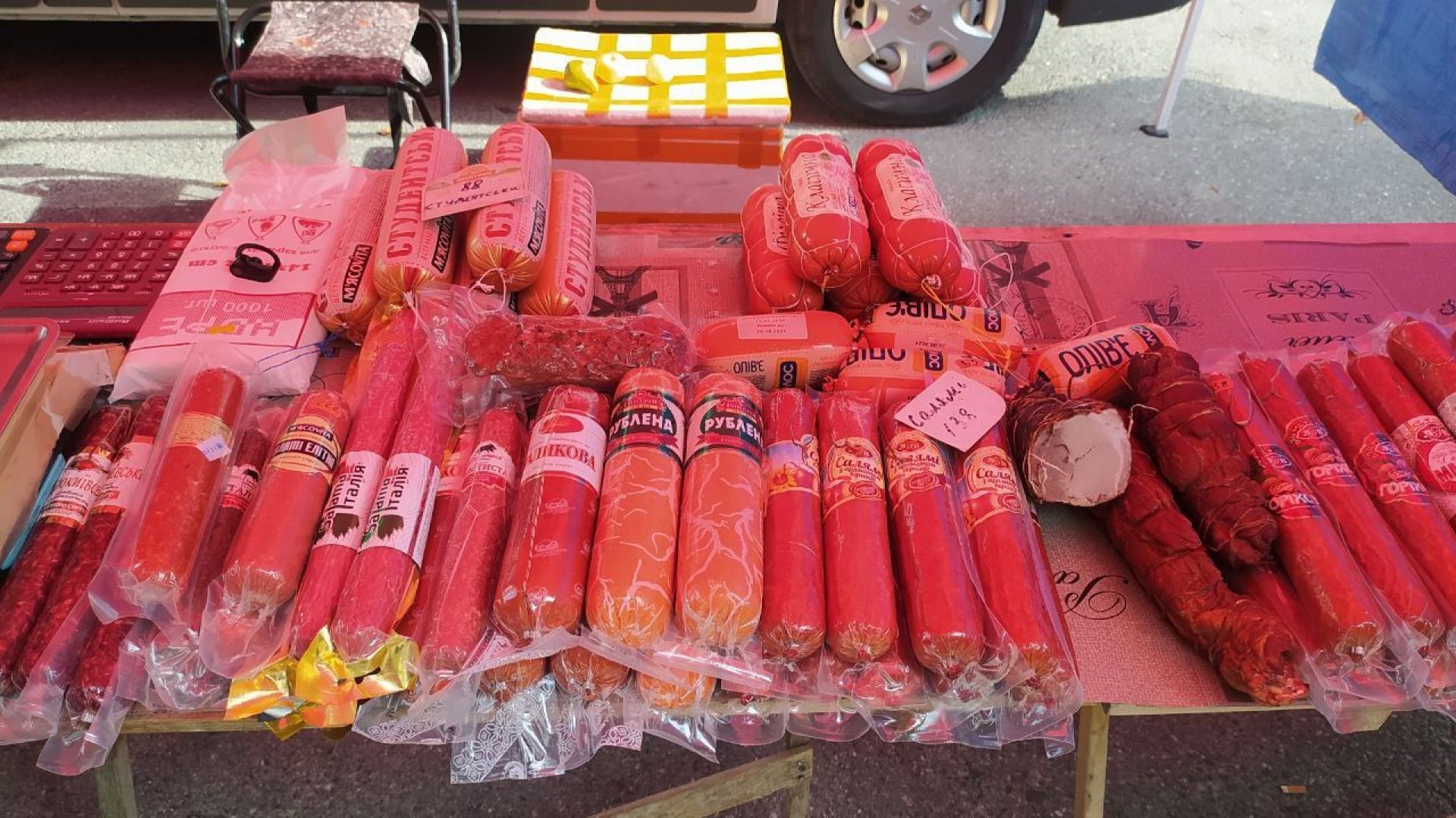 З м’ясного також є що вибрати. Є шинка, бочок копчено-варений, копчено-печений, сало по гуцульськи, кров’янка, тушонки, рулетки з чорносливом і сиром, смажена ковбаска, молочна ковбаса, напівкопчена, бандерівська, є кільцьові ковбаски, сальтисон, сало та інше. Є курятина і свинина. До прикладу, четвертинка курки 75 грн, шия свині 220.