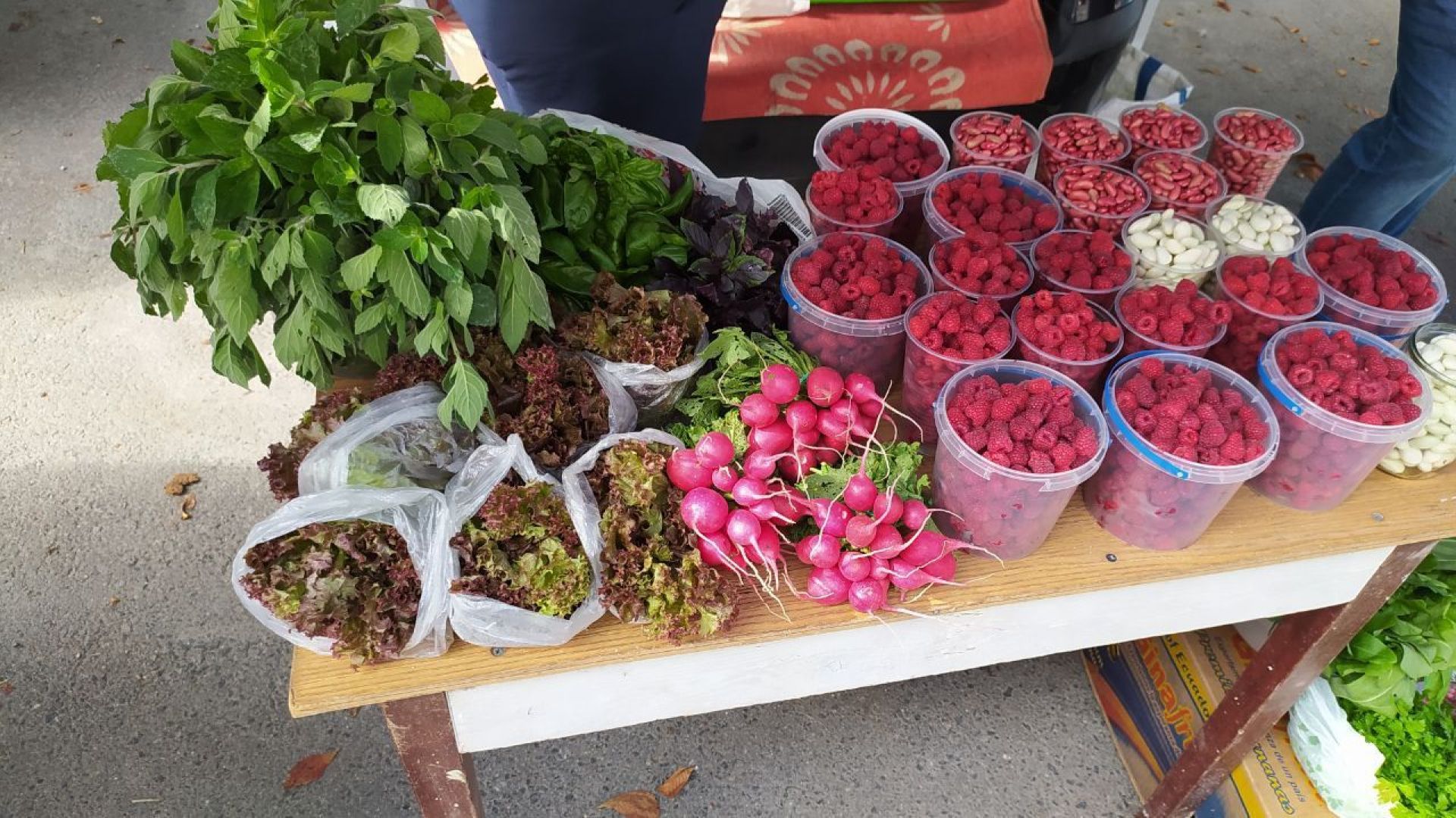 Зелень: м'ята , меліса , салат по 10 грн пучок ,є також базилік, щавель і редиска 20 по грн. Рукола – 25 грн пучок.