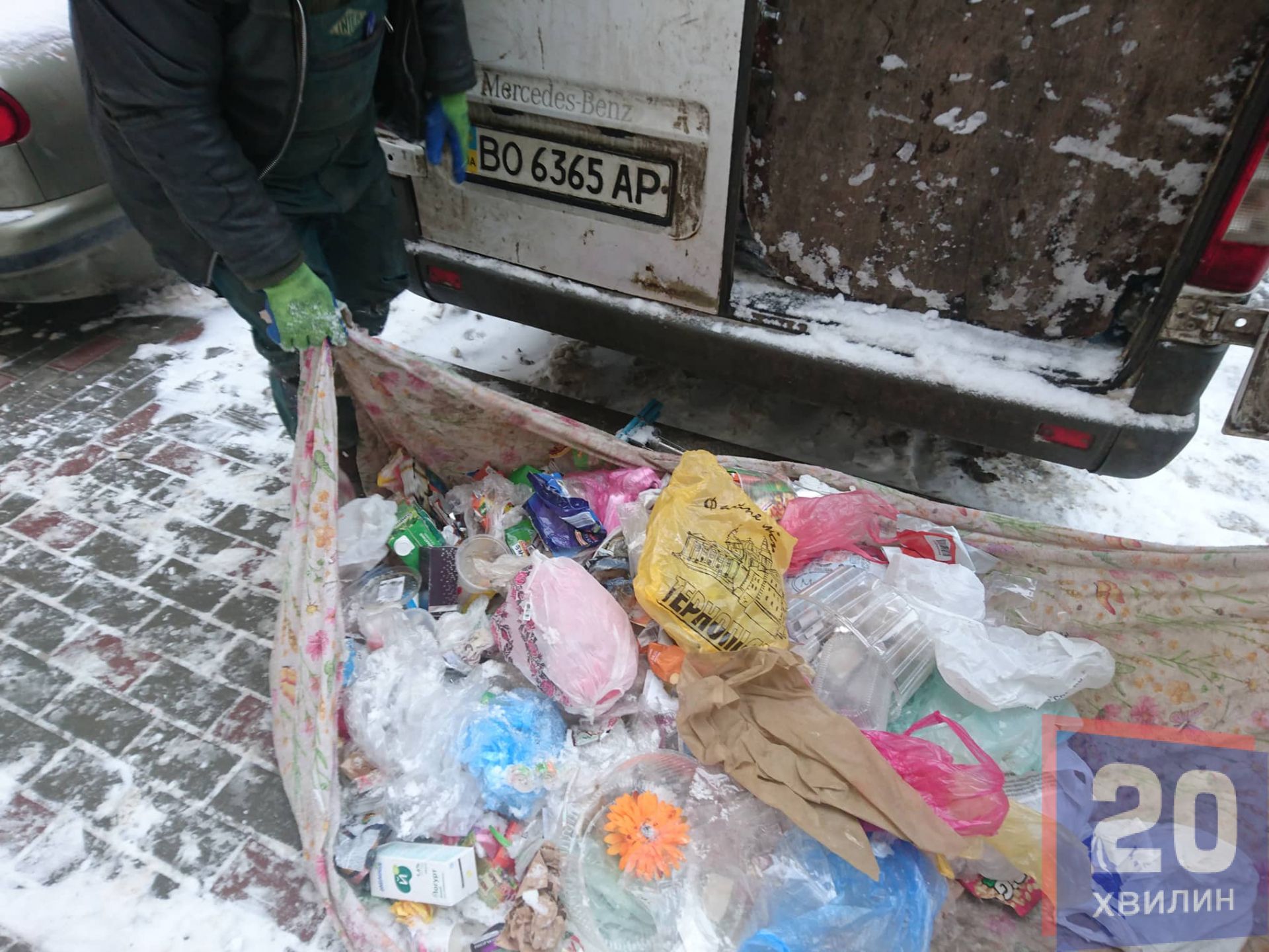 Поки розмова тривала, працівники перебрали усе сміття із сітки. Пляшки - в авто, а решту висипали на верету і викинули у контейнер для змішаних відходів.
