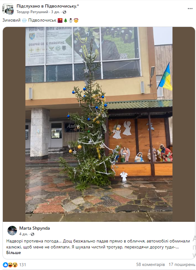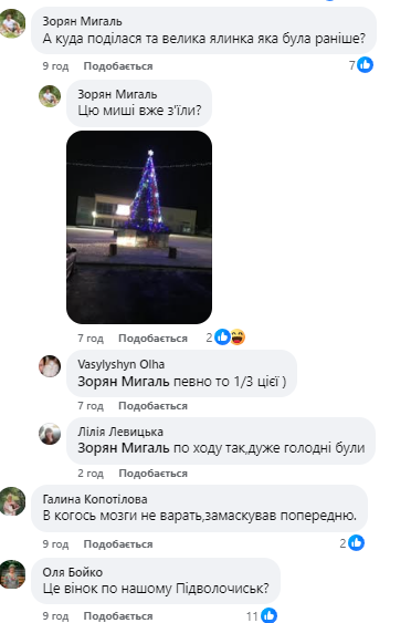 — Більшість з нас зараз трішки подібні на головну ялинку селища Підволочиськ на Тернопільщині... — з таким підписом репост світлини зробили в іншій групі.