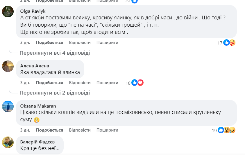 У коментарях людям не сподобався новий дизайн. Мовляв, схожа на вінок, який впав на голову Януковичу у 2012-му. Цікавляться люди також і долею попередньої ялинки. Хтось припускає, що її просто доповнили новими гілками.