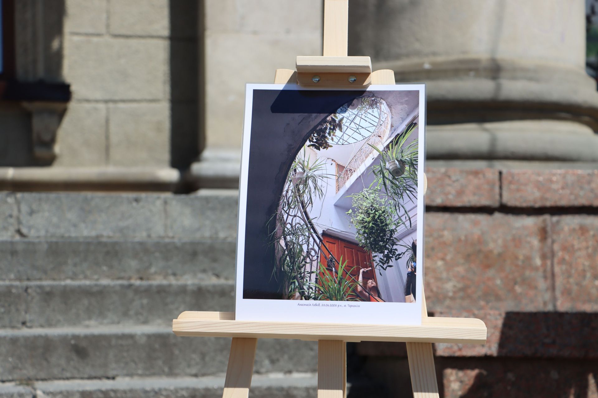 На сходах Драмтеатру встановили мольберти з дитячими світлинами. Авторами фотографій є діти-внутрішньо переміщені особи та з сімей наших військових, які обороняють Україну на передовій.