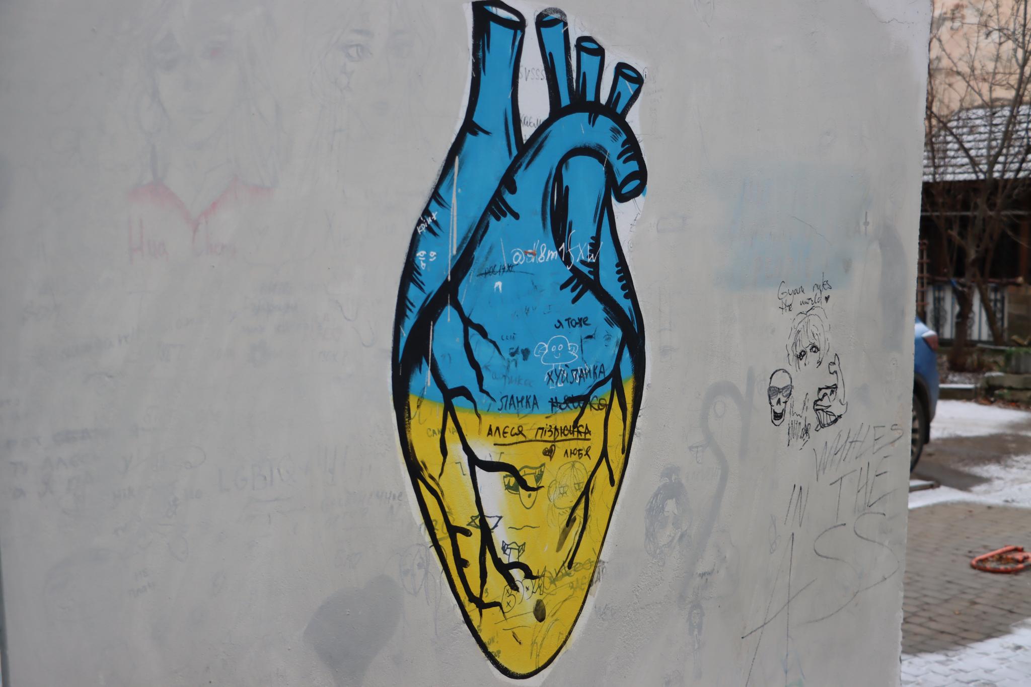 Цей дворик був суцільним полотном. Однак стіни вирішили зафарбувати. Більшість малюнків зникла, залишили лише кілька — серед них серце в кольорах українського прапора.